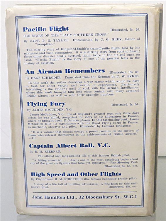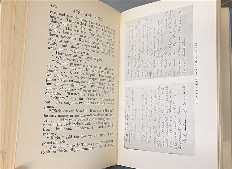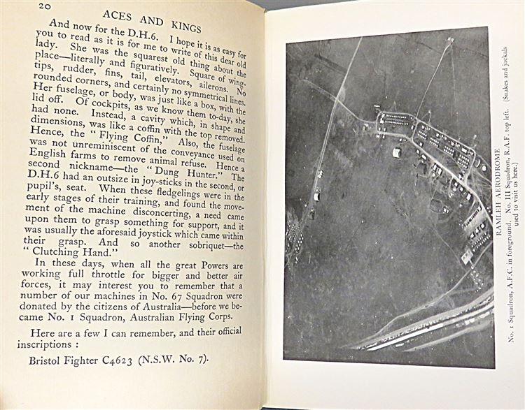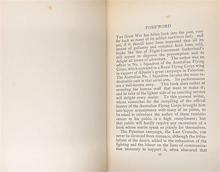 St Mary's Books is proud to present this remarkably well preserved first UK edition of "Aces and Kings" by L. W. Sutherland, the story of the Australian "Warbirds" during the Great War. Housed in its original pictoral dustjacket featuring a stunning full colour illustration of places in battle over mountains, this hardback book is bound in blue cloth with gold gilt lettering to its spine. Inside, one finds i-xii and 276 pages of text complete with stunning contemporary black and white photographs such as the frontispiece image of the No.1 Squadron Australian Flying Corps. This book, which traces the author's experiences as a pilot in the Australian 67 Squadron R. F. C. in Palestine, contains incredible stories such as his encounters with Laurence of Arabia. This book is in very good condition, though there is a bookplate on the free endpapers and some minor tearing to the dustjacket - remarkably, this edition appears otherwise unread. "Aces and Kings" is looking for a new home, and would make for the perfect gift for any aviation enthusiast or military historian.