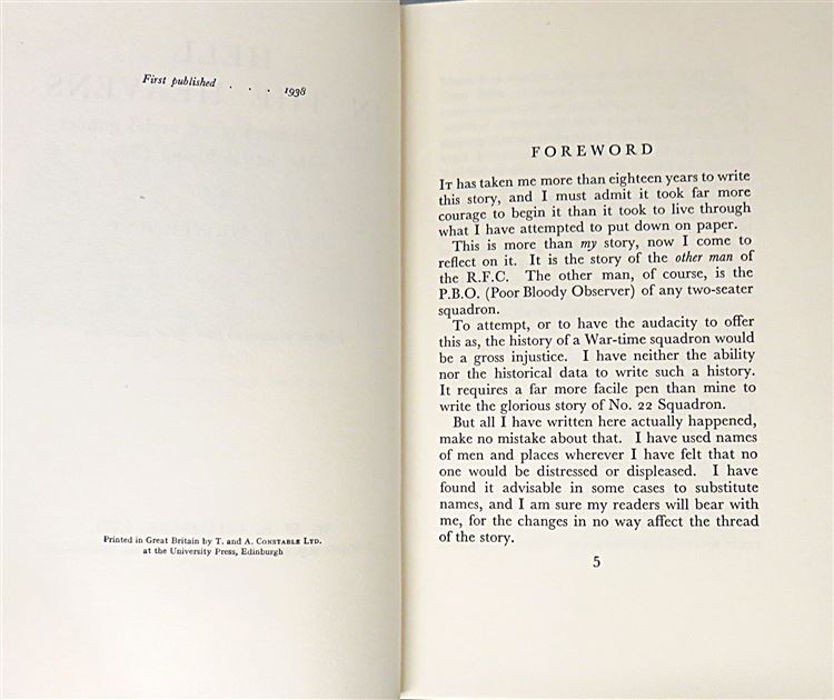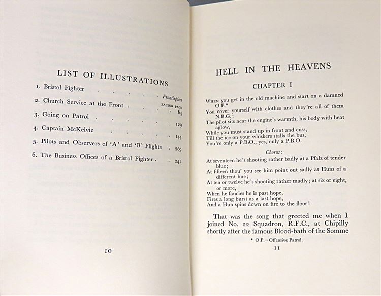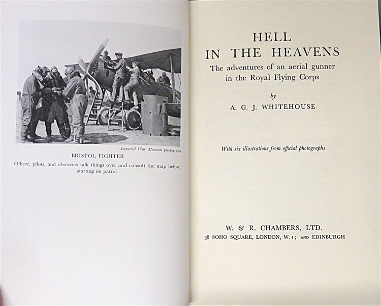 This lovely 1938 first edition of "Hell in the Heavens" by A. G. J. Whitehouse is housed in its original blue dustjacket featuring a charming illustration of an aeroplane soaring above the clouds. Bound in light blue cloth with blue ink lettering to the spine, this hardback book contains 262 pages of text supplemented with contemporary black and white photographs such as the frontispiece image of "Bristol Fighter". This incredible story, taken from a dog-eared notebook, details the breathtaking adventures of the war fought in the air over No Man's Land. This copy, and its original dustjacket, are in very good condition, with few notable blemishes other than some very minor foxing to the spine of the book and fading to the spine of the dustjacket. "Hell in the Heavens" is looking for a new home, and would make for a perfect gift for any aviation enthusiast or military historian.