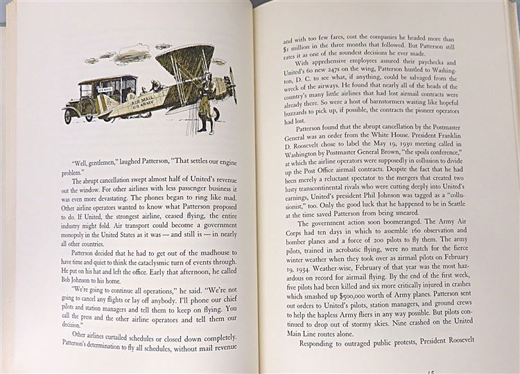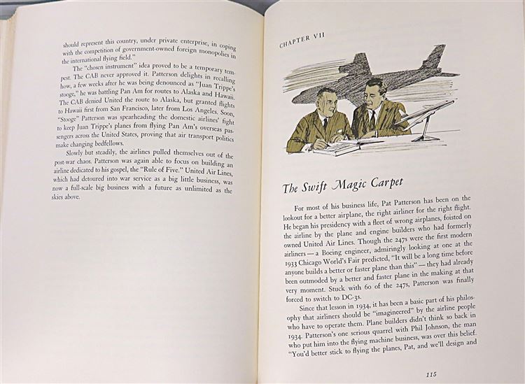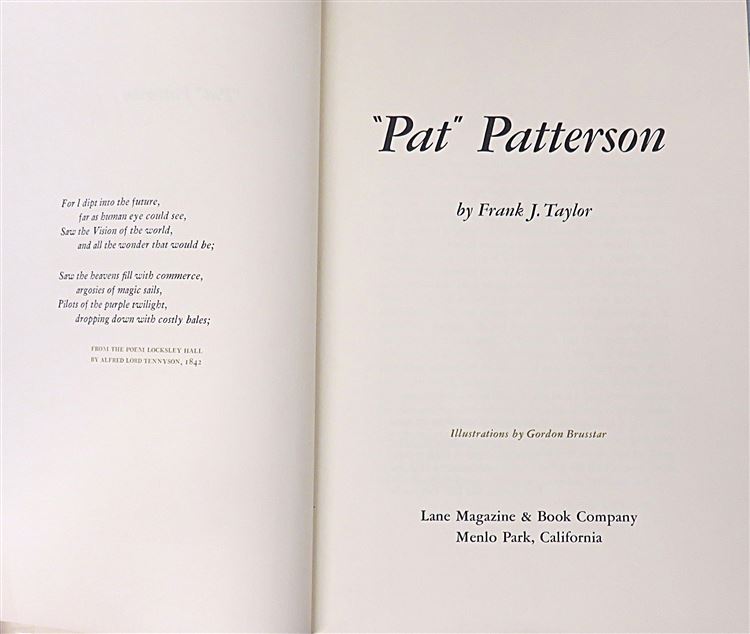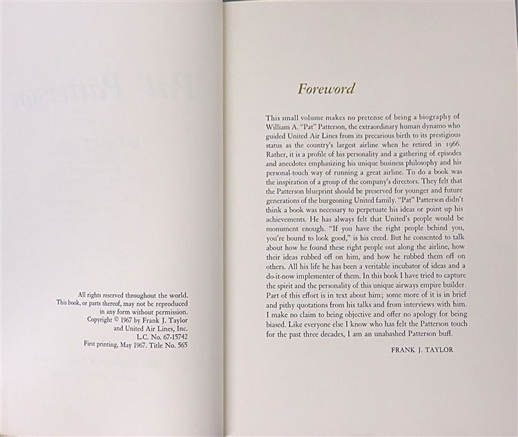 St Mary's Books is proud to present this 1967 first edition of ""Pat" Patterson" by Frank J. Taylor, the story of the man who guided United Air Lines from its birth to its status as leading US Airline. Bound in quarter blue cloth, this hardback book features gold gilt lettering and a charming blue ink illustration of William A. "Pat" Patterson. Inside, one finds 160 pages of text supplemented by Gordon Brusstar's charming illustrations. This book is in very good condition, with few notable blemishes other than some light fading to the cover, this copy is remarkably well preserved. ""Pat" Patterson" is looking for a new home, and would make for a lovely gift for any aviation or United Air Lines enthusiasts.