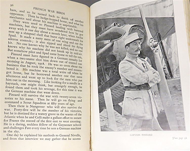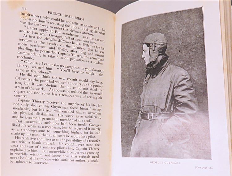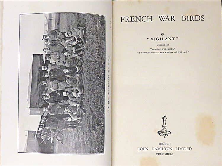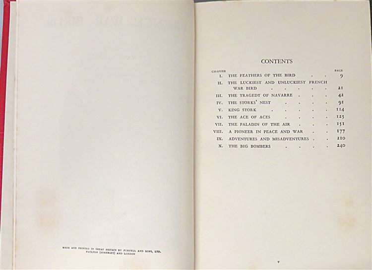St Mary's Books is proud to present this early edition of "French War Birds" by "Vigilant" housed in its original pictorial dustjacket featuring French aeroplanes soaring above the clouds. Bound in red cloth with black ink lettering to the spine, this hardback book contains i-vii and 256 pages of text, peppered with stunning contemporary black and white photographs, such as the image on the frontispiece of "Escadrille des Cigognes". This wonderful book, which highlights the achievements of notable French airmen and the spirit of camaraderie and chivalry which drove them, stories which were at the time relatively unknown to British audiences. This book, and its original dustjacket, are in good condition, with few notable blemishes or imperfections other than some minor tearing and bumping to the dustjacket and the boards of the book, as well as some minor foxing throughout the book. "French War Birds" is looking for a new home and would make for a perfect gift for any aviation enthusiast or military historian.