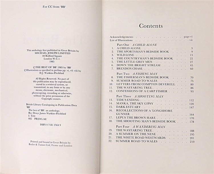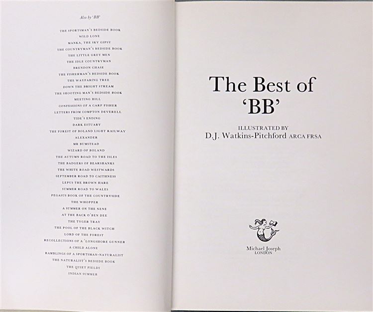 St Mary's Books is proud to present this 1985 first edition of "The Best of "BB" An Anthology" signed by the author himself, "BB" or Denys Watkins-Pitchford. Housed in its stunning original dustjacket featuring a charming painting of robins in the countryside, this hardback book is bound in cream cloth with black lettering on the spine. Inside, one finds 278 pages of text, peppered with BB's stunning original illustrations, which add a sense of whimsy and help cement these tales of life in the countryside. This anthology features favourites such as "The Little Grey Men" and "Manka the Sky Gipsy", with the extracts containing both his stories for adults and children. This copy, and its original dustjacket, are in very good condition - with few notable blemishes or imperfections, they appear virtually unread and as-new. "The Best of "BB" An Anthology" is looking for a new home, and would make for a perfect gift for any nature enthusiast or BB fan.
