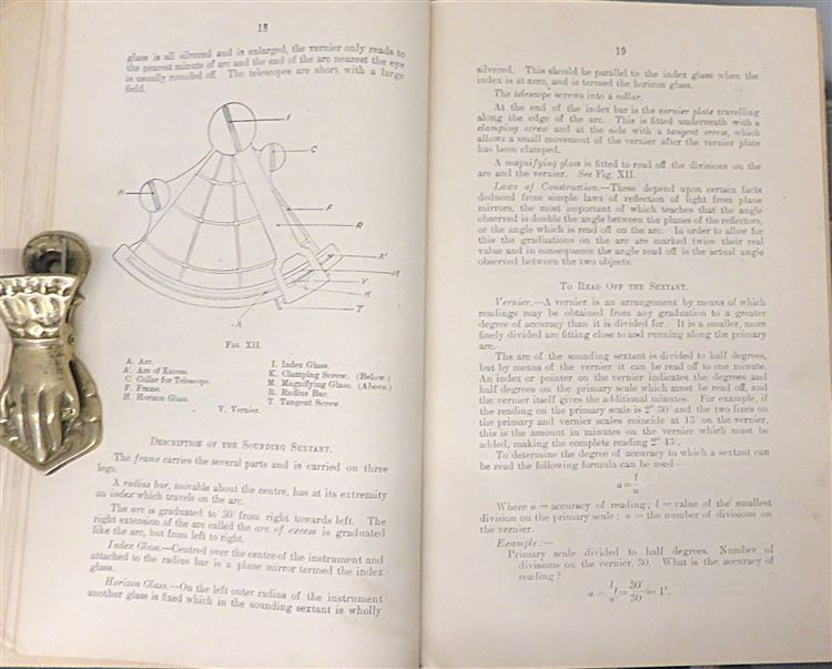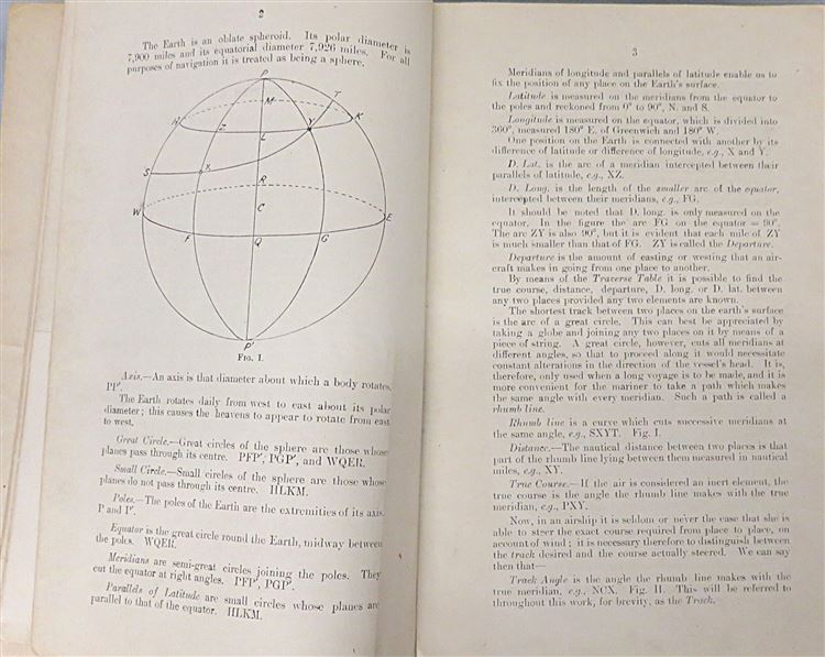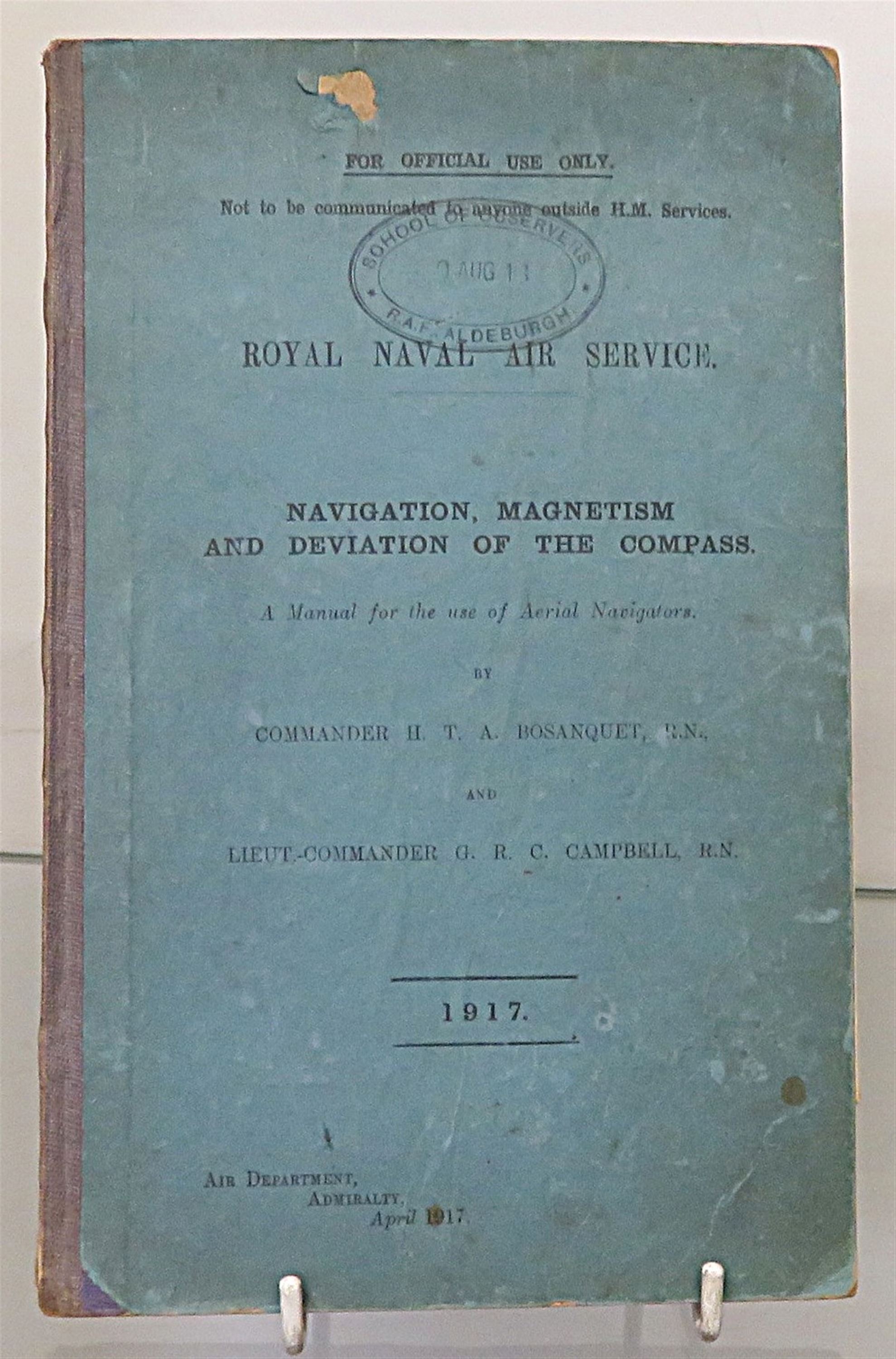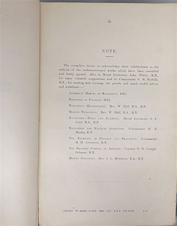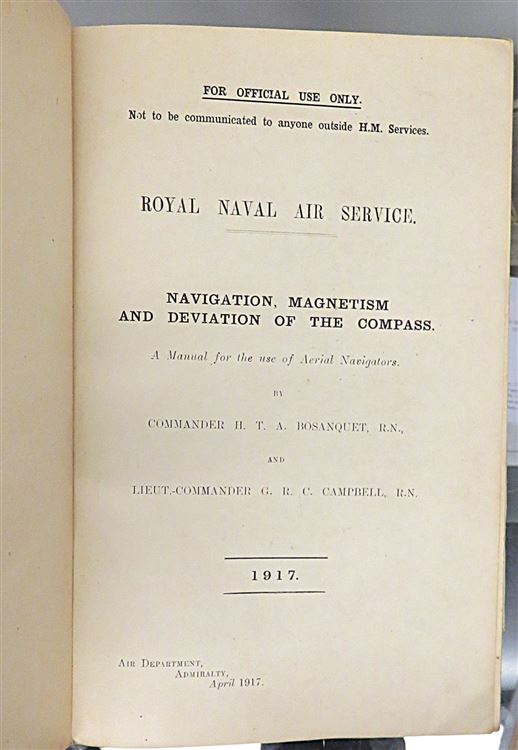 Hardback. A scarce title written by Commander H.T.A. Bosanquet and Lieut.Commander G.R.C. Campbell. Quarter bound in blue cloth with paper covered sides. There is a little loss and an ink stamp to the front. Neat inscription to the front free endpaper and toning throughout, the pages otherwsie a re cleana nd illustrated with several diagrams, some folding. Errata slip between the contents page and chapter I. pp. iv + 98 + 4. A detailed manual with sections on; bearing and courses, to read off the sextant, charts and maps, measurement and scale and much more. An ineresting title, a must for any aviation enthusiast.