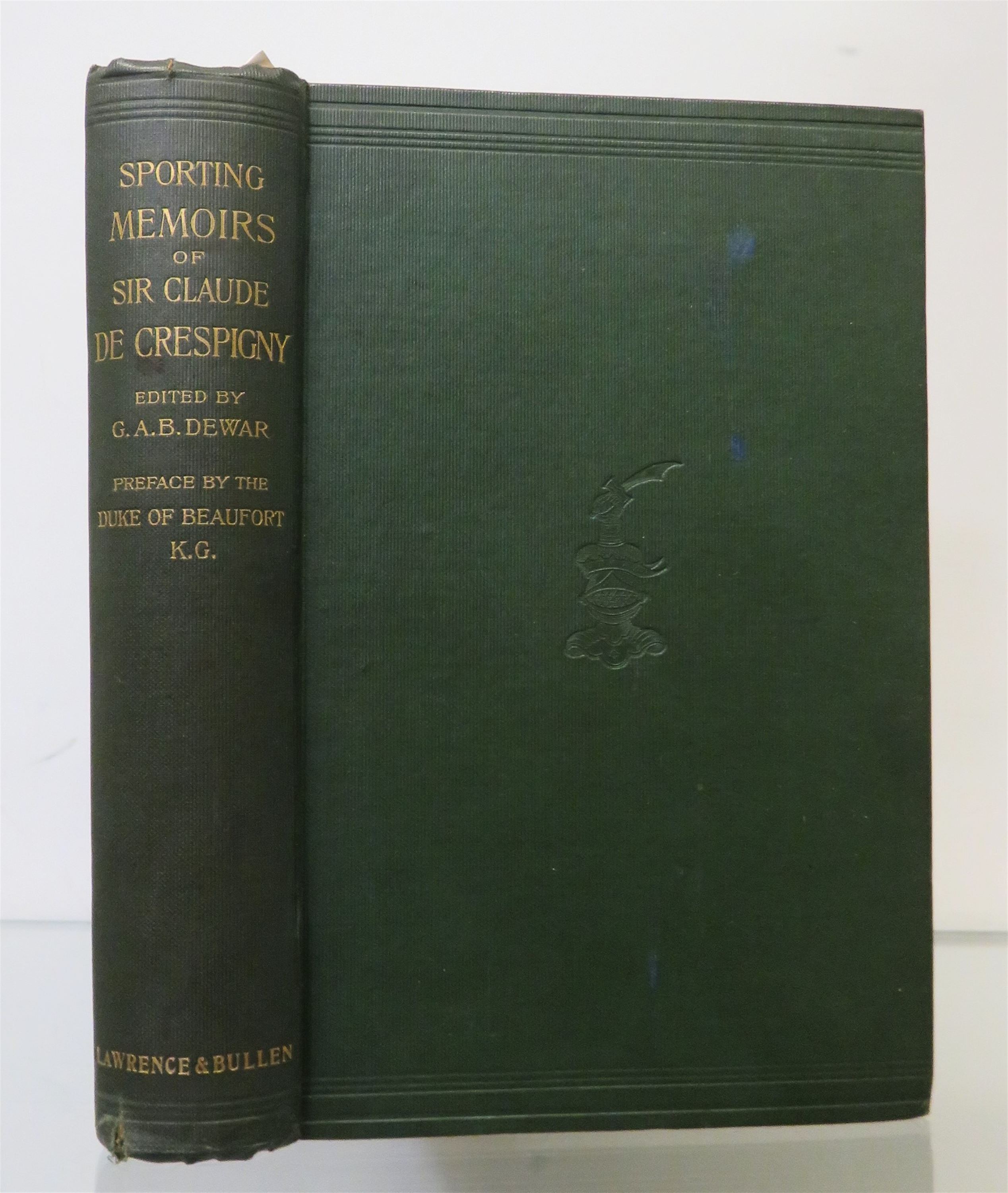 An informative and interesting memoir documenting the steeple-chasing, hunting and other sporting feats of Sir Claude Champion de Crespigny, edited by George A. B. Dewar and with a preface by the author's acquaintance, the Duke of Beaufort. This copy has relevent newspaper articles about Sir Claude de Crespigny pasted into the front endpapers. This lovely edition is bound in green cloth with gilt lettering on the spine. Overall, it is in very good condition with clean and bright pages all throughout. There are some subtle marks to the covers and a closed tear to the bottom edge of the spine. This book would be appreciated by anyone, young or old, with an interest in field sports. pp. 371.