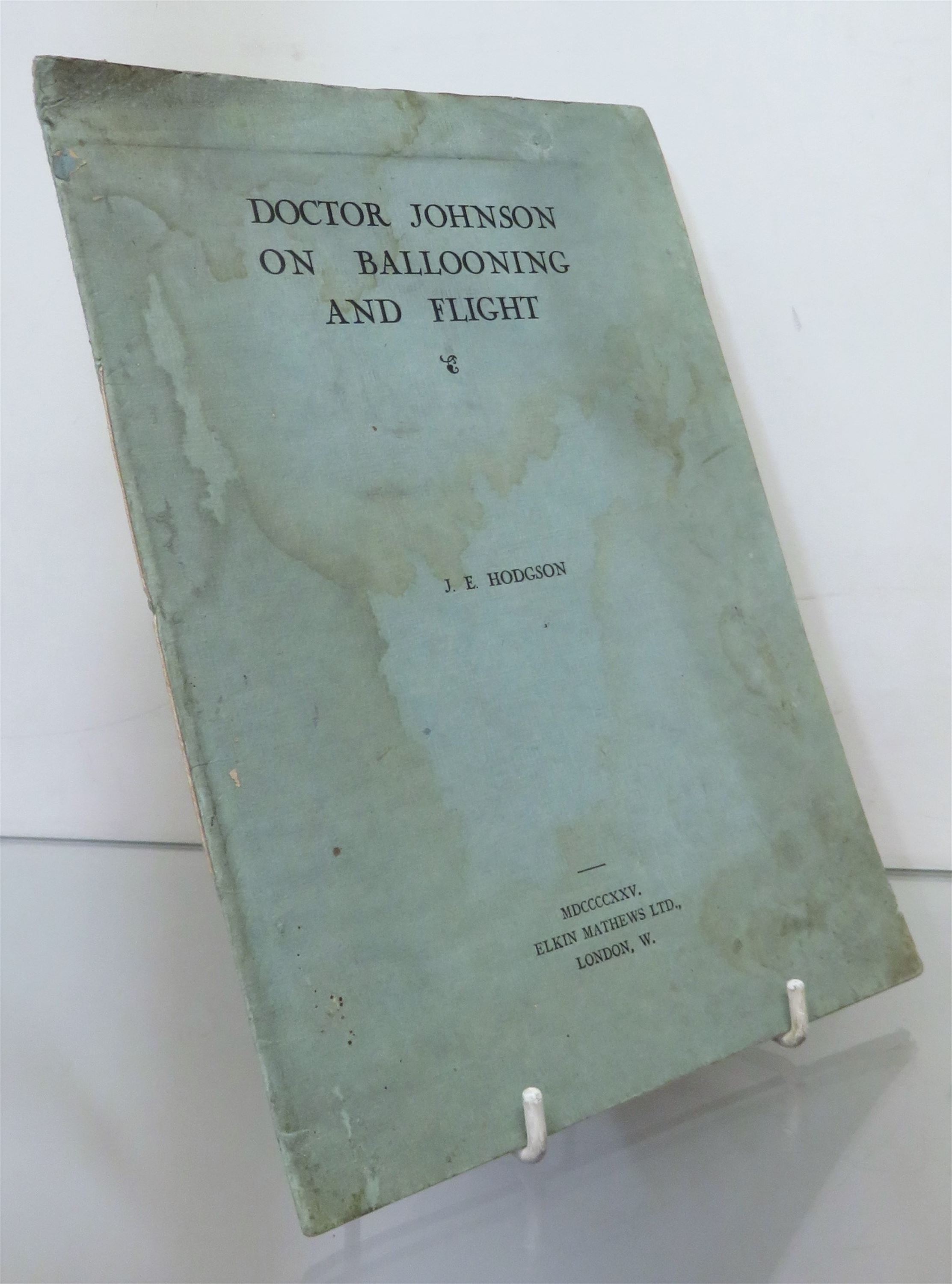 This is an extremely limited edition publication, with this copy being No. 90 of only one hundred and fifty copies having been printed. This short leaflet explores the influence that Samuel Johnson had on ballooning and flight. Overall, this copy is in good condition, with clean and bright pages throughout. There is water damaged to the covers and two closed tears, one to the top of the spine, and the other to the bottom edge of the back cover. pp. 12.