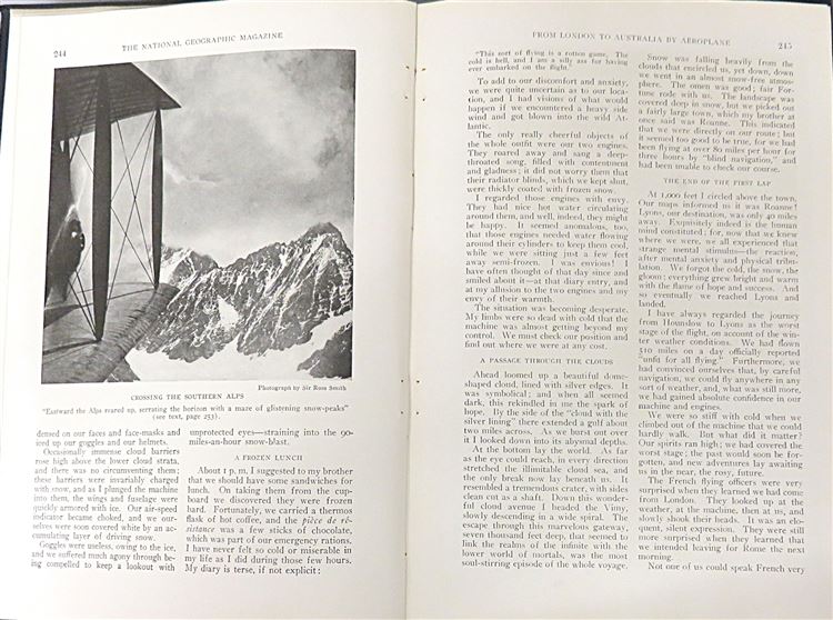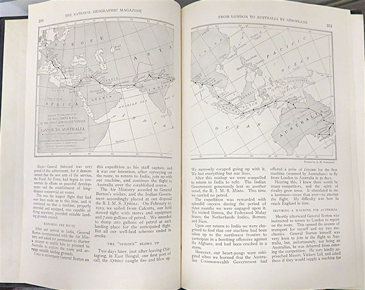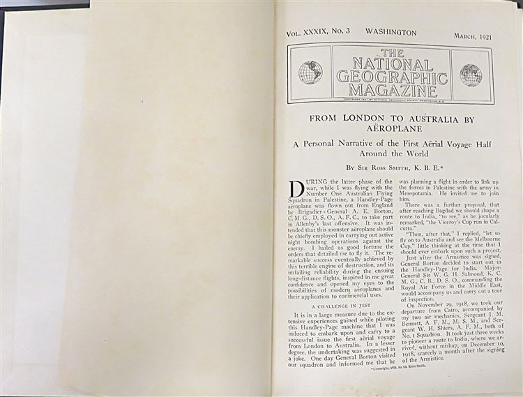 This lovely March 1921 edition of "The National Geographic Magazine" features the article "From London to Australia by Aeroplane: A Personal Narrative of the First Aerial Voyage Half Around the World" by Sir Ross Smith K. B. E.. as well as "America in the Air: The Future of Airplane and Airship, Economically and as Factors in National Defense" by Brigadier-General William Mitchell. Contained in a later black hardback binding with gold gilt lettering, this book has 123 pages of text, and is pages 229-352 of the Magazine. These two articles, featuring black and white photographs and insightful commentary on contemporary aviation, are in good condition,with few notable blemishes other than some damage to the center of the boards, and that the hinges are splitting slightly. These snippets from "The National Geographic Museum" are looking for a new home, and would make for the perfect gift for any aviation enthusiast.