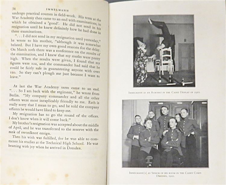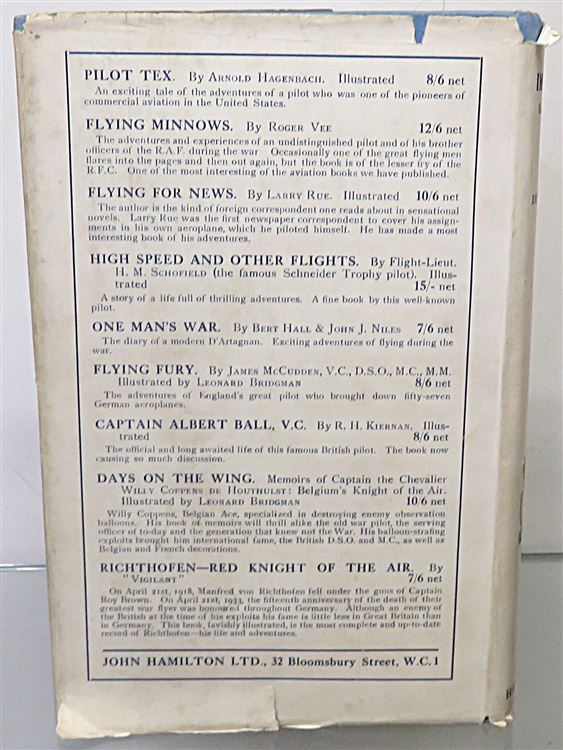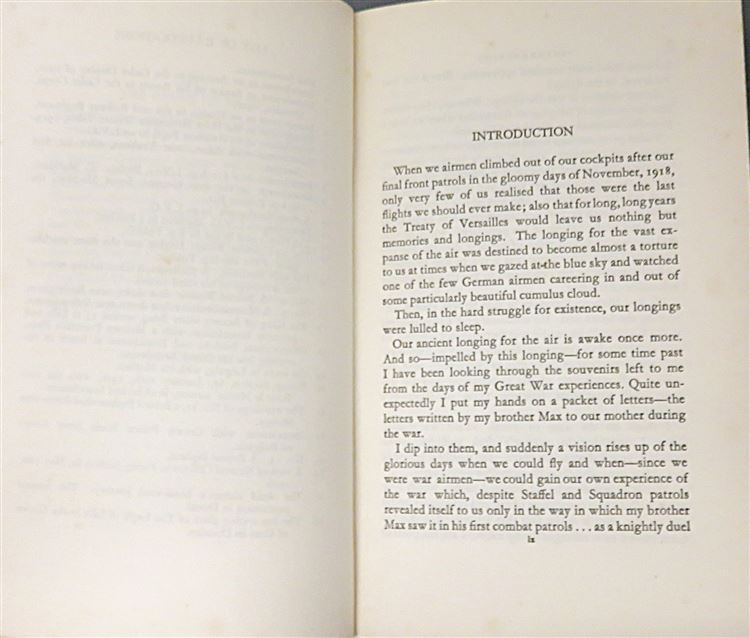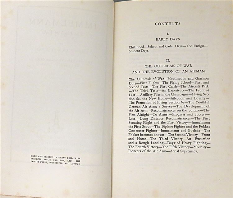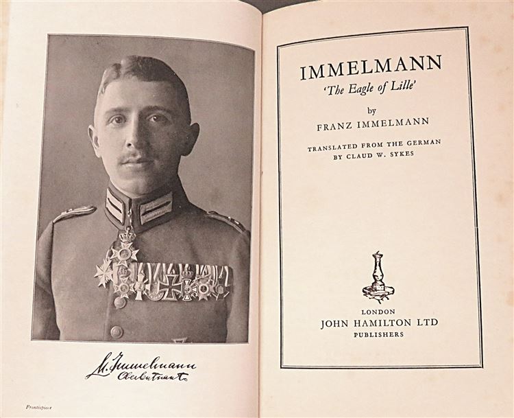 St Mary's Books is proud to present this English language edition of "Max Immelman: Eagle of Lille", a biography written by his brother Franz Immelman. Housed in its original pictorial dustjacket featuring a full-colour illustration of two aeroplanes dogfighting, this hardback book is bound in light blue cloth with gold gilt lettering to its spine. Inside, one finds i-xii, 223pp. and 40 pages of advertisements to the back of the book. This biography of the first German "ace" describing his experiences in the Army Cadet School and in the German Air Service, as well as giving an overview of the German Air Force, is peppered with contemporary black and white photographs setting the scene for the reader. This copy is in good condition - though the dustjacket is bumped and torn, and though there is some foxing throughout this book, it remains well preserved for a copy of this age and rarity. "Max Immelmann: Eagle of Lille" is looking for a new home and would make for a perfect gift for anyone hoping to better acquaint themselves with a personal history of the German Air Service.