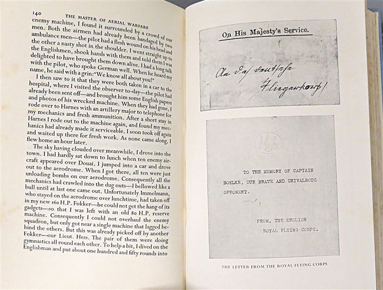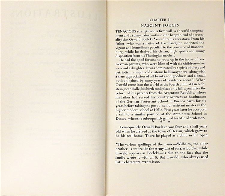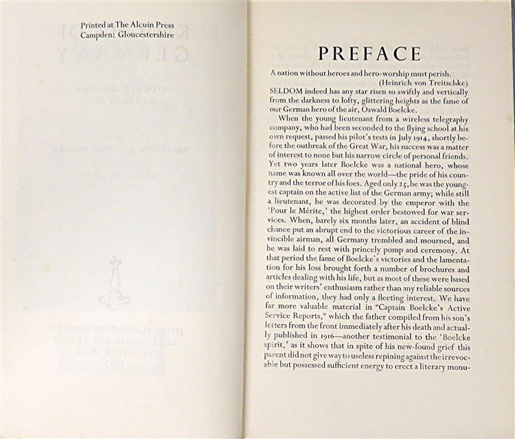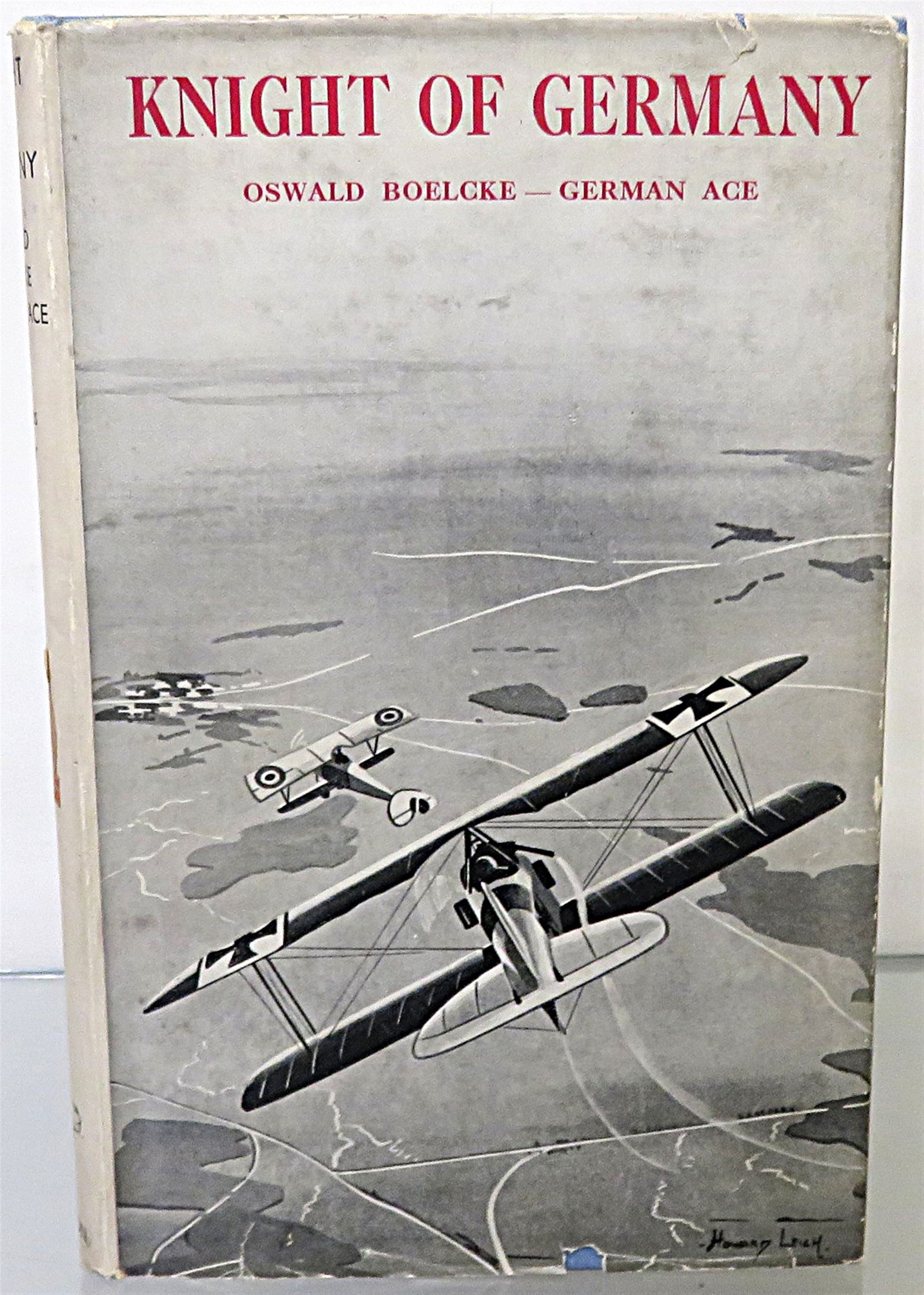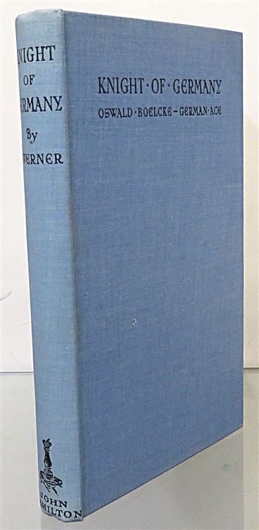 This lovely 1933 edition of "Knight of Germany: Oswald Boelcke - German Ace" is housed in its original dustjacket, featuring a black ink illustration of a dogfight by Howard Leigh. Bound in light blue cloth with black ink lettering, this hardback book contains 241 pages of text, peppered with stunning contemporary black and white photographs, and complete with a map of the Westfront to the back of the book. This fantastic book provides a sympathetic biography of one of Germany's deadliest wartime flyers, Oswald Boelcke, who is described as a kind-hearted gentleman and sportsman who killed his enemies with great regret. This copy, and its original dustjacket, are in very good condition - with few notable blemishes or imperfections other than some minor bumping to the dustjacket and some minor foxing to the edges of the book. "Knight of Germany" is looking for a new home and would make for the perfect gift for any aviation enthusiast.
