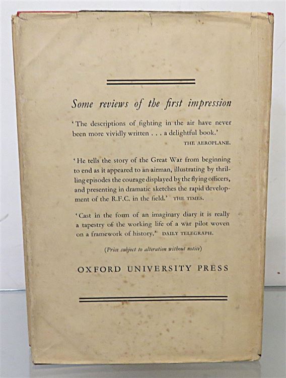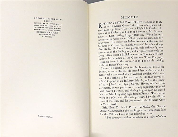 St Mary's Books is proud to present this lovely 1928 edition of "Letters from a Flying Officer" by Rothesay Stuart Wortley. Housed in its original cream dustjacket with blue ink decorations, this hardback book is bound in black cloth with quarter red cloth and gold gilt lettering to the spine. Inside, one finds i-ix and 207 pages of text providing a fictional account of service in the Air Force made up of diaries and letters, but based on the authors' real experiences in the war. This book has a charming frontispiece, which is an incredibly well preserved black and white photograph of Rothersay Stuart Wortley. This book, and its original dustjacket, are in very good condition - with few notable blemishes or imperfections other than a minor tear to the dustjacket and to page vii, it appears virtually unread. "Letters from a Flying Officer" is looking for a new home and would make for the perfect gift for any lover of military history.