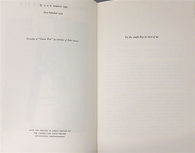 This lovely 1969 first edition of "Birds and Fools Fly" by John Urmston is housed in its original blue and white dustjacket featuring a photograph of an aeroplane. Bound in grey cloth with gold gilt lettering to the spine, this hardback book contains 169 pages of text and is complete with a black ink illustration of an aeroplane at the back of the book. This eccentric true story of a small-town practicing doctor who taught himself to fly is in very good condition, there are no notable blemishes or imperfections on the book or its dustjacket. "Birds and Fools Fly" is looking for a new home and would make for the perfect gift for anyone looking to read a humorous true story.