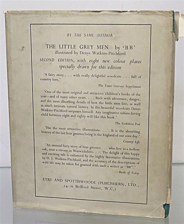 Hardback. A good copy of Denis Watkins-Pitchford classic story, the sequel to The Little Grey Men. This copy is complete with the original unclipped dust jacket. Underneath lie green cloth boards with light bumping to the corners, otherwise showing very little wear. The dust jacket is discoloured with pieces missing to the extremities. The pages within are clean despite the odd spot of foxing to the margins of the text. pp. 200. Beautifully illustrated with several colour plates and numerous line drawings within the text. Overall a good copy.