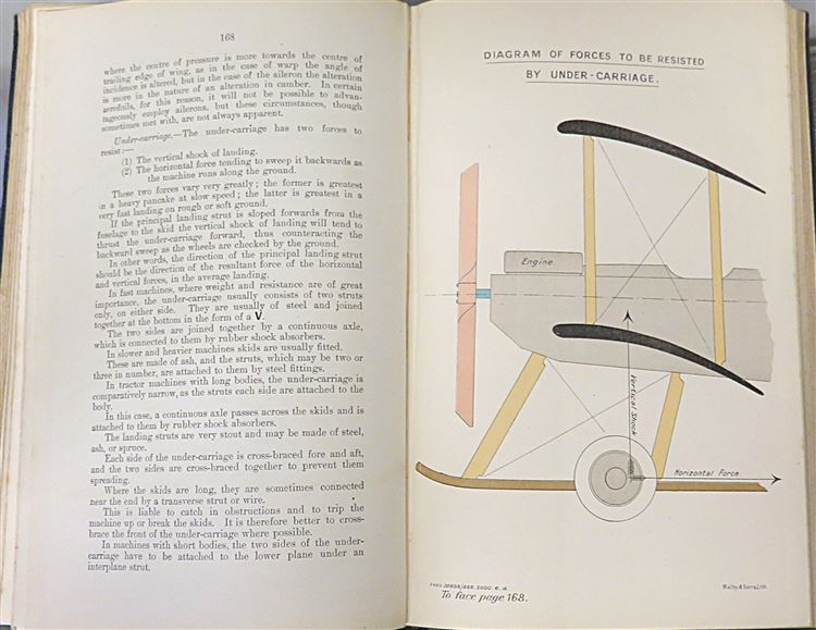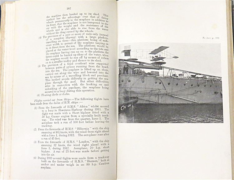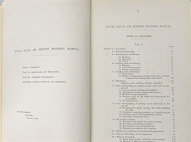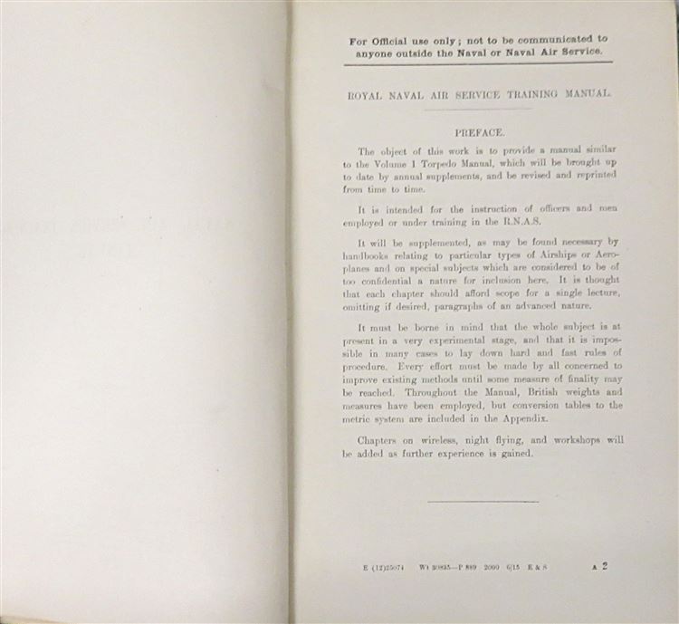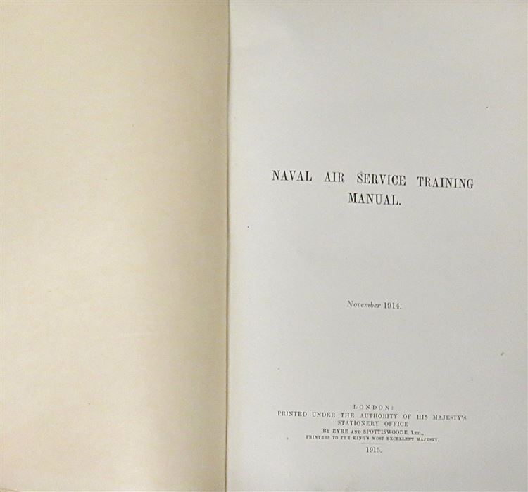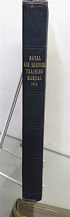 St Mary's Books is proud to present this 1915 Naval Air Service Training Manual produced by the Admiralty's Air Department. Bound in navy cloth with intricate blind tooling and detailed borders, this hardback book has gold gilt lettering to its spine. Inside, one finds 338 pages of text, including various black ink and full colour diagrams, black and white photographs, mathematical equations, and fold out illustrations all intended for the instruction of officers employed or under trainign in the R. N. A. S.. This copy is in very good condition - other than some slight wearing to the spine and some bumping to the corners, the interior remains remarkably clean and readable for a copy of this age and rarity. This 1915 Naval Air Service Training Manual is looking for a new home, and would make for a perfect gift for anyone interested in this chapter of British military history.