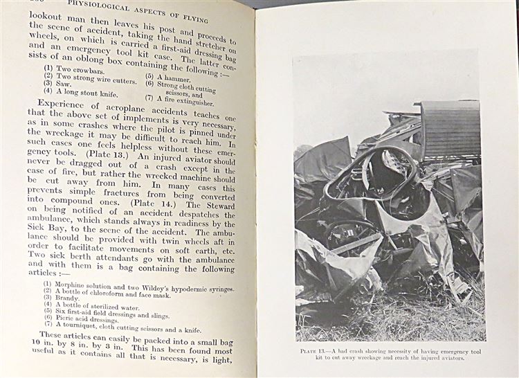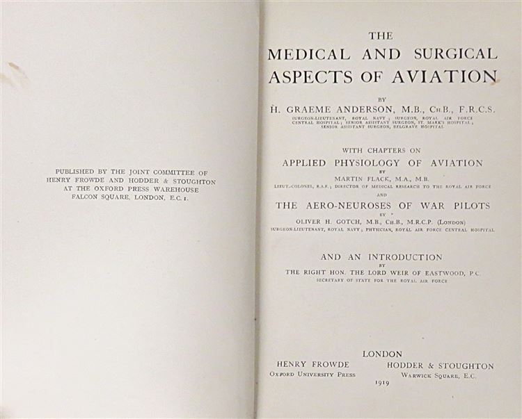 St Mary's Books is proud to present this 1919 edition of "The Medical and Surgical Aspects of Aviation" by H. Graeme Anderson. Bound in red cloth with black ink lettering, this hardback book contains i-xvi and 255 pages of text peppered with black and white photographs of various ailments that the airmen might suffer. This was the first book of its kind to focus explicitly on the medical impact of flying on the aviator, and to suggest various remedies and safety procedures to limit any potential damage. This copy is in very good condition, other than some slight wearing on the spine and an inscription on the front free endpaper, this book has been impeccably well preserved considering its age and rarity. "The Medical and Surgical Aspects of Aviation" is looking for a new home and would make for the perfect gift for anyone interested in the medical history of aviation.