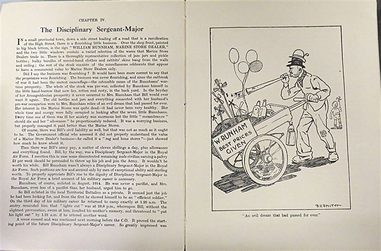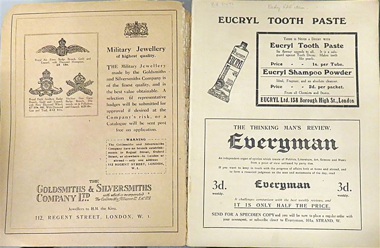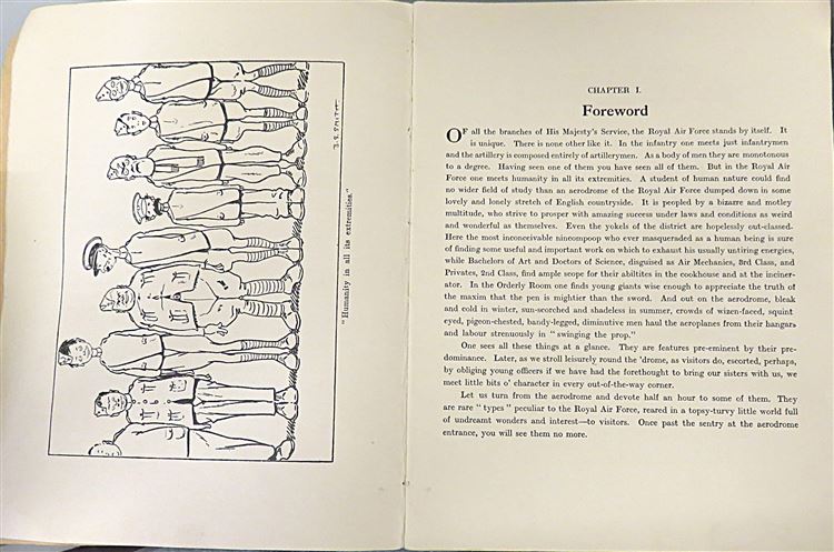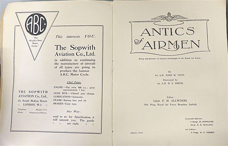 St Mary's Books is proud to present this March 1919 edition of "Antics of Airmen: Being pen-pictures of popular personages in the Royal Air Force" by 1st A.M. John H. Venn with illustrations by 1st A.M. B. S. Smith. This paperback book features a charming black ink cartoonish illustration of an airman smoking on the cover, and the book itself is peppered with similar such illustrations of the various RAF archetypes. Inside, one finds 48 pages of humorous text highlighting the various aspects of the RAF as well as their personalities, peppered with contemporary adverts that might appeal to the reader - such as for toothpaste, car insurance, and RAF Uniforms. This copy is in very good condition, other than an inscription and some slight bumping on the cover, the text remains remarkably clean and readable for a copy of this age and rarity. "Antics of Airmen" is looking for a new home and would make for the perfect gift for any aviation enthusiasts.