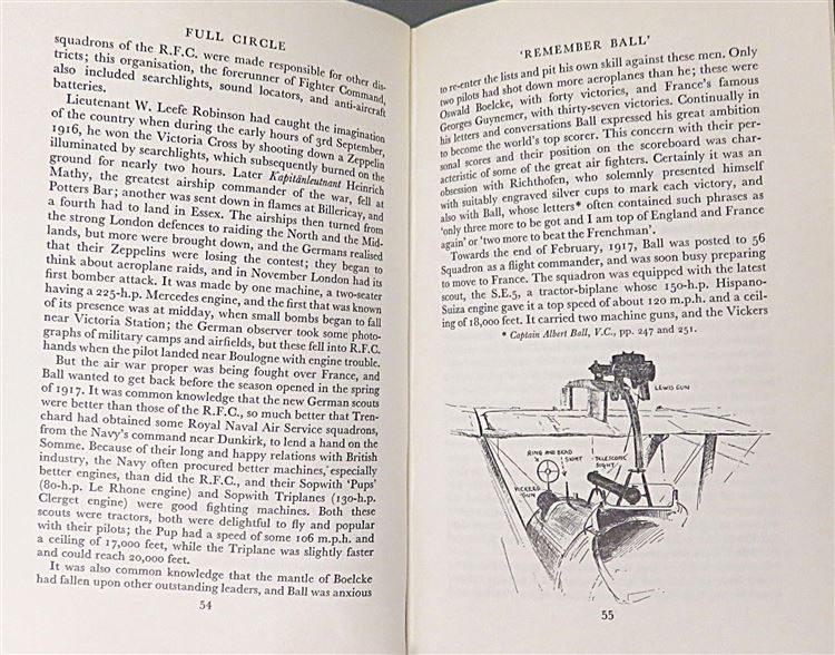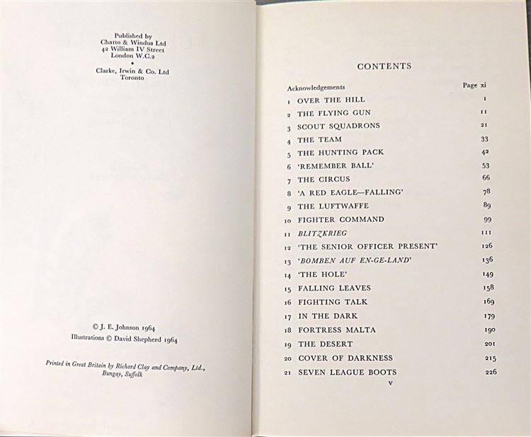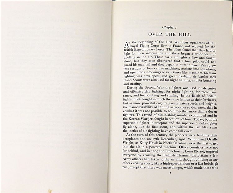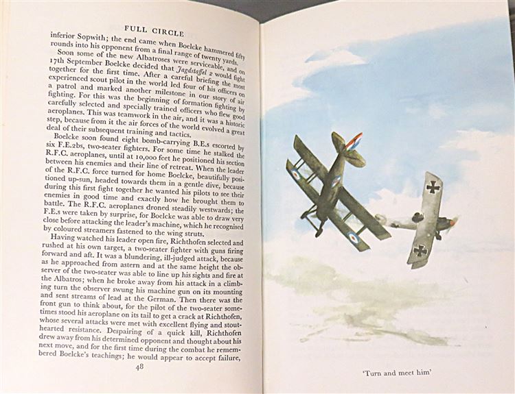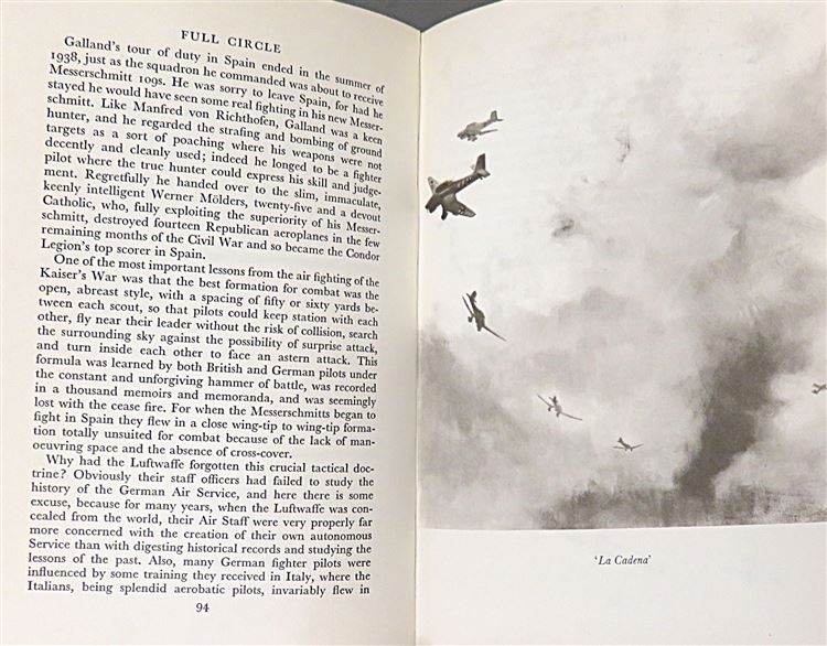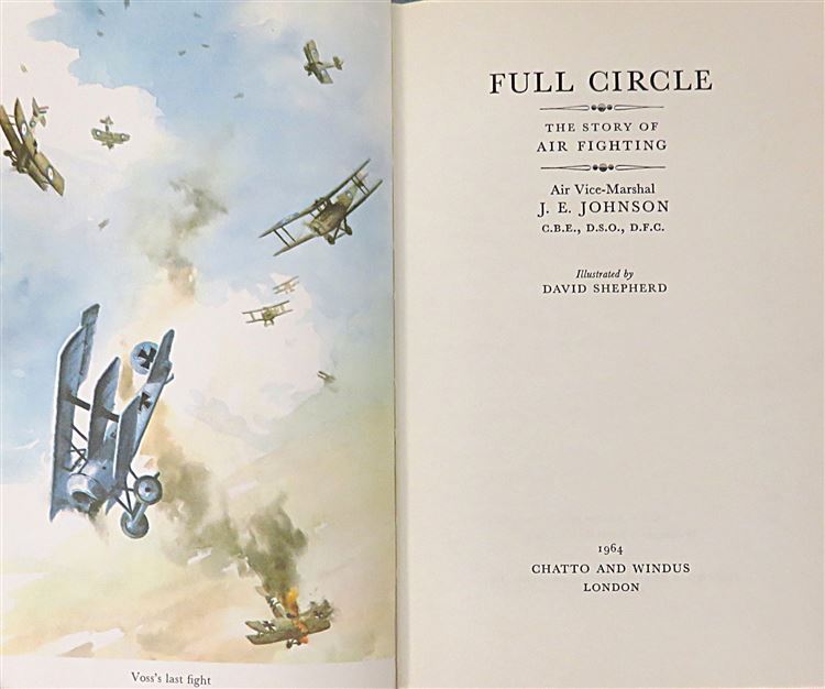 This lovely 1964 first edition of "Full Circle: The Story of Air Fighting" by Air Vice-Marshal J. E. "Johnnie" Johnson with illustrations by David Shepherd is housed in its original dustjacket featuring a lovely painting of the clouds. This hardback book is bound in blue cloth with gold gilt lettering to the spine, and contains i-xi and 290 pages of text. In this book, Air Vice-Marshal Johnson the top-scoring allied fighter pilot of WW2 tells us the story of the great fighter leaders of both wars and the way their actions shaped air combat. This narrative is supplemented by 37 of David Shepherds stunning black ink and full-colour illustrations, such as the frontispiece illustration of "Voss' Last Flight". "Full Circle" is impeccably well preserved, and is in very good condition - this copy is looking for a new home and would make for the perfect gift for any aviation enthusiast.
