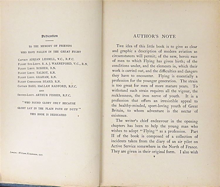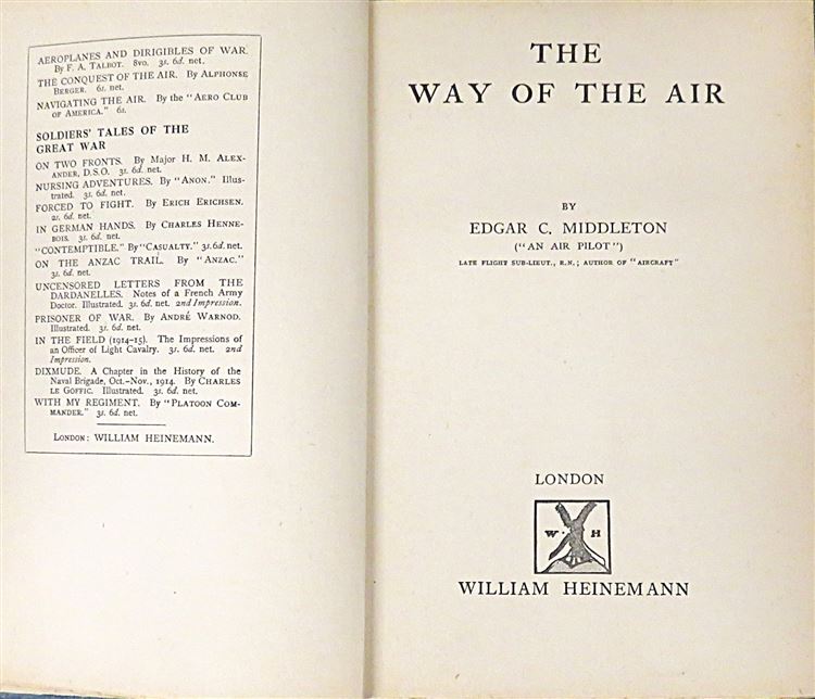This lovely 1917 edition of "The Way of the Air" by Edgar C. Middleton or "An Air Pilot" is housed in its original dustjacket featuring a black ink illustration of an aeroplane. Bound in blue cloth with black ink lettering and borders, this hardback book contains i-viii and 184 pages of text inteded to assist the young man who wants to adopt flying as a profession and relaying incidents taken from the diary of an air pilot in Active Service in Northern France during the Great War. This book is in very good condition - though the dustjacket is faded and damaged and thus can only be described as fair - the book itself has been well-preserved, with few notable blemishes or imperfections. "The Way of the Air" is looking for a new home and would make for a perfect gift for any aviation enthusiast hoping to gain a more personal understanding of the experiences of airmen.