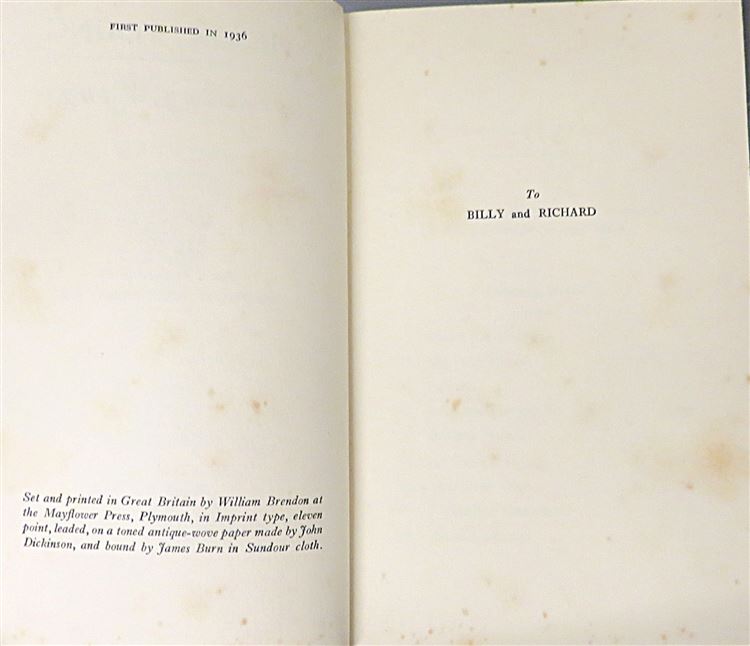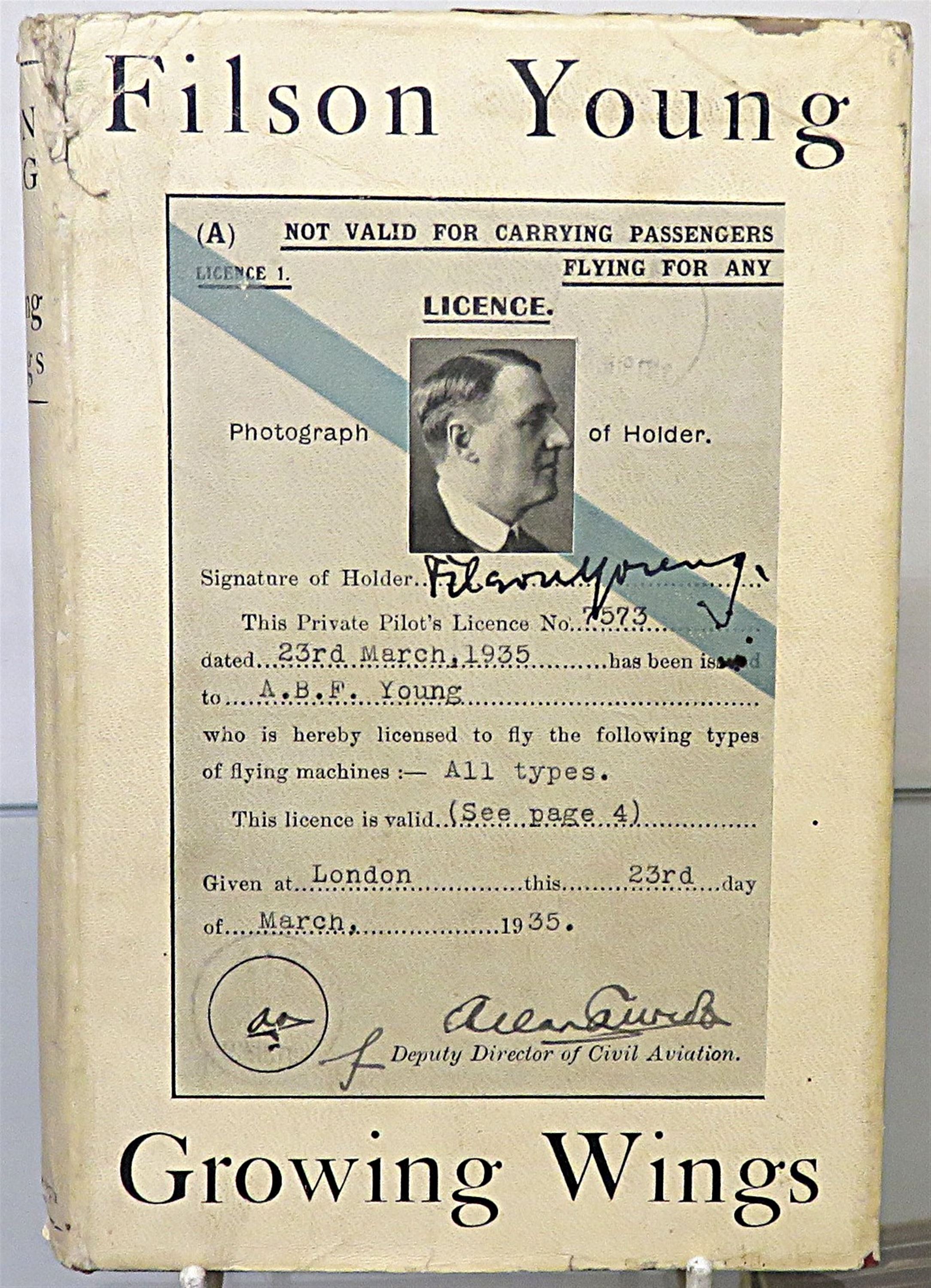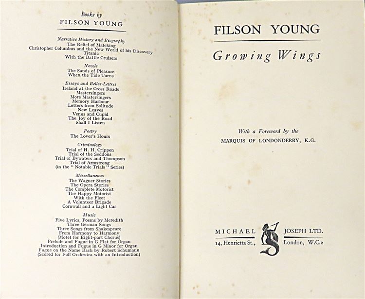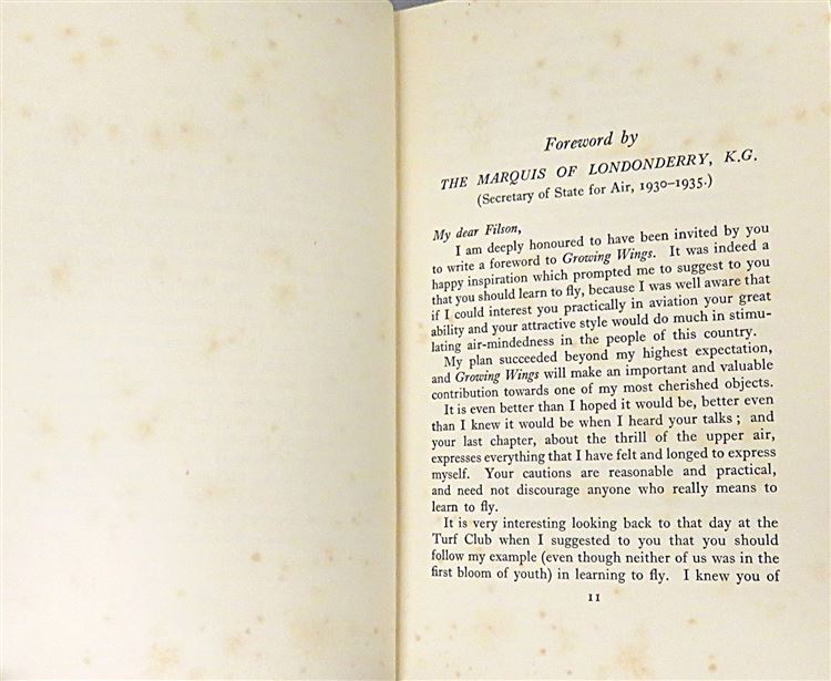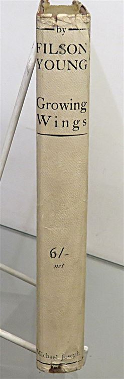 This lovely 1936 first edition of "Growing Wings" by Filson Young is housed in its original white dustjacket, featuring a photograph of Young's Pilot's Liscence. Bound in burnt orange cloth with yellow lettering to the spine and yellow top-edge staining, this hardback book contains 180 pages of text. Inside, past the bright yellow free endpapers, one finds the inspiring story of a 58 year old who chose to learn to fly, an intruiging chapter of a life full of adventure. This book, and its original dustjacket, are in good condition. The dustjacket is slightly bumped and torn and the book itself is foxed, however it remains well-reserved considering its age and rarity. "Growing Wings" is looking for a new home and would make for a perfect gift for any aviation enthusiast, or any lover of an inspiring true story.