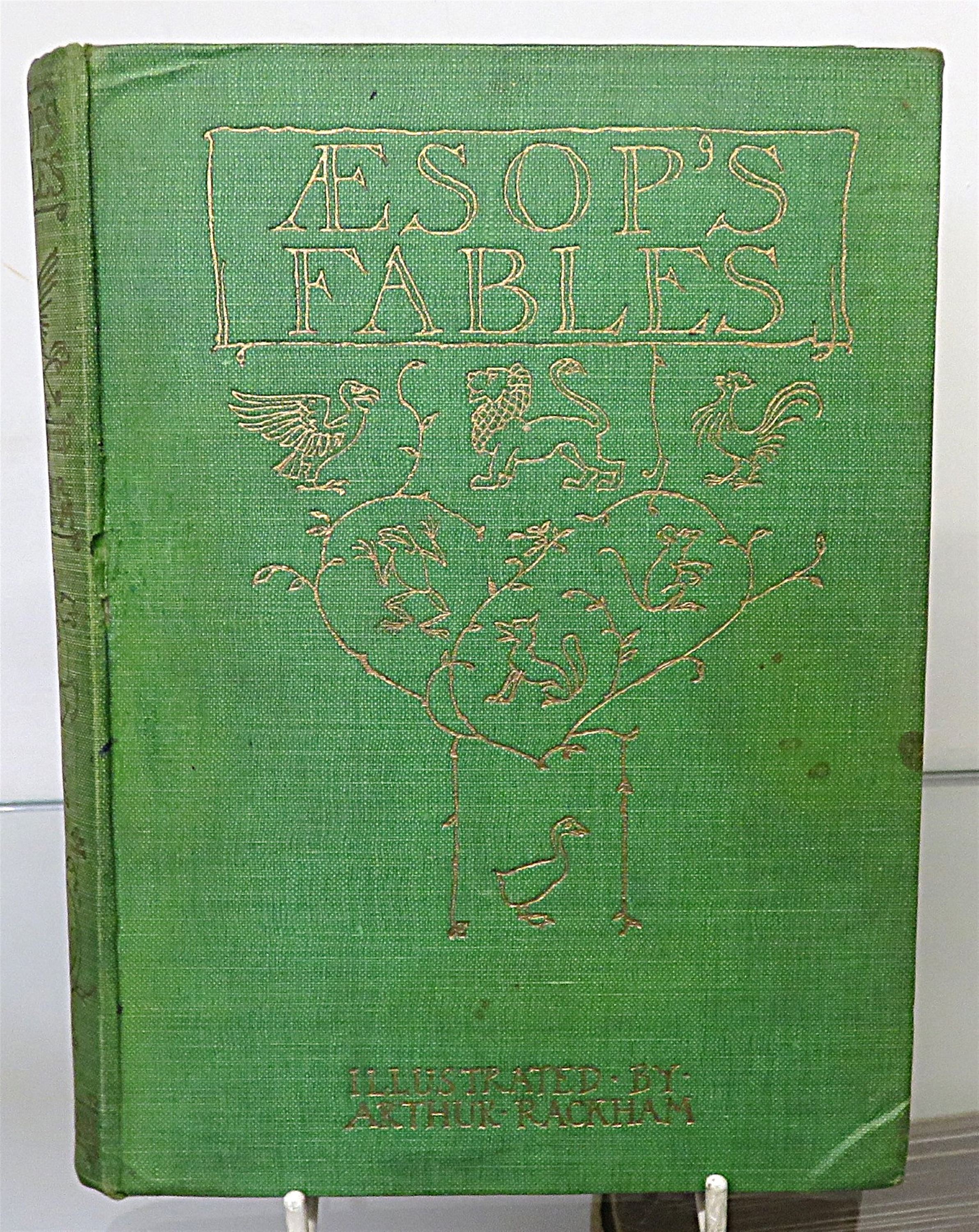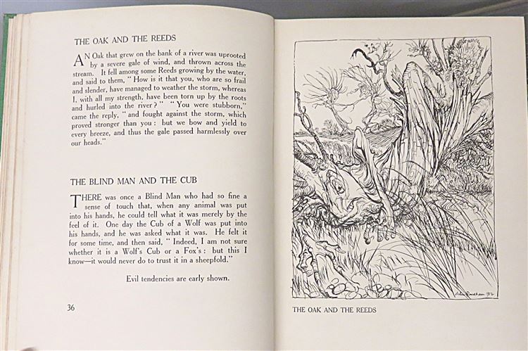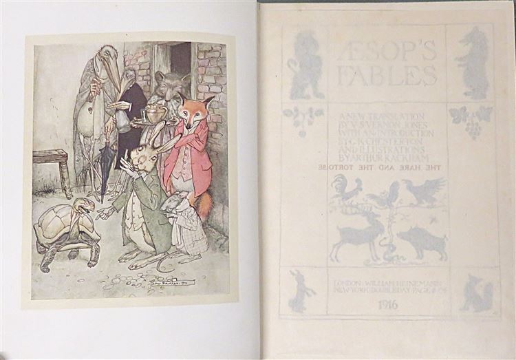 A New Translation By V.S. Vernon Jones, With an Introduction by G.K Chesterton. Hard Back. 1916, New impression of this beautifully illustrated book. Handsomely bound in the publisher's original green cloth with simple gilt illustration and titles to the front and spine. Illustrated front and rear endpapers with numerous black and white line drawings within the text, together with colour plates each with its tissue guards. Overall a very good copy with the binding presenting well despite light bumping and discolouration to the boards, and fading to the spine. The pages are clean despite the occasional spot of foxing and a neat signature to the front free endpaper. pp. xxix + 224. Stories include; The Goose That Laid The Golden Eggs, The Wolf And The Lamb, The Lion And The Mouse and many many more.