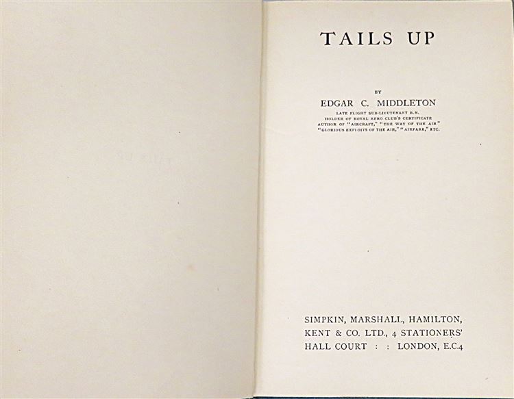 This lovely hardback 1918 first edition of "Tails Up" by Edgard C. Middleton is bound in blue cloth with black ink lettering and a border on its cover. Inside, one finds 314 pages of text, detailing the everyday lives of servicemen in the field and on the seas, with a description of the incidents they faced, and all based on Middleton's wartime experiences. This copy is in remarkably good condition - with very little wearing to the cloth boards, and the pages appear clean and bright - this copy has been very well preserved for a book that is over 100 years old. This 1918 first edition of "Tails Up" by Edgar C. Middleton is looking for a new home and would make for the perfect gift for anyone hoping to read a fascinating personal account of the Great War.