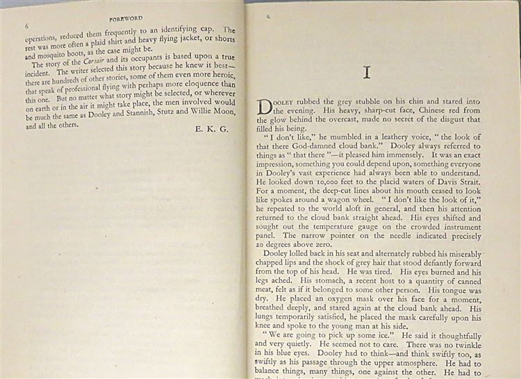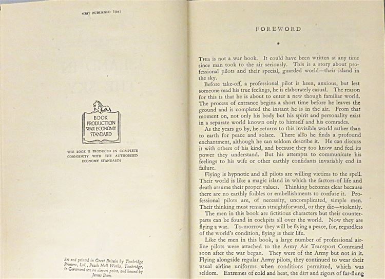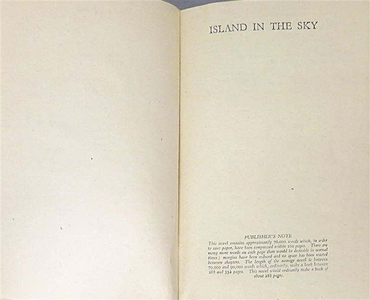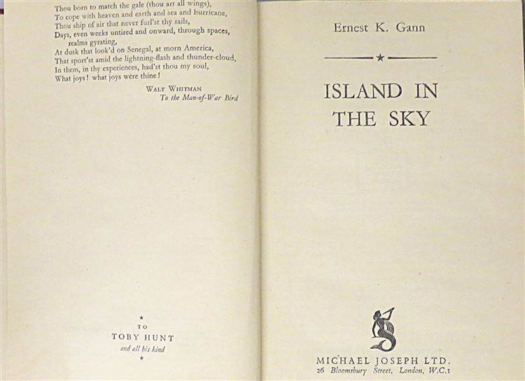 St Mary's Books is proud to present this 1945 first edition of "Island in the Sky" by Ernest Gann. Housed in its original black dustjacket with blue ink lettering, this hardback book is bound in maroon cloth with silver gilt lettering to its spine. Inside, one finds 160 pages of text containing this tale, based on a true story, where a transport pilot and his crew must survive in the gruelling cold of the Canadian Wilderness after their plane crashes. This copy is in very good condition, with few notable imperfections other than an inscription on the front free endpaper, it is remarkably well preserved consdering its age and rarity. The original dustjacket, however, has suffered significant losses and thus can only be described as fair to good. "Island in the Sky" is looking for a new home and would make for the perfect gift for any lover of an inspiring survival story based on true events.