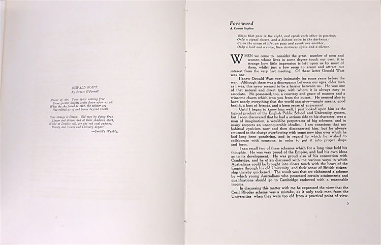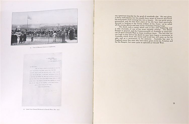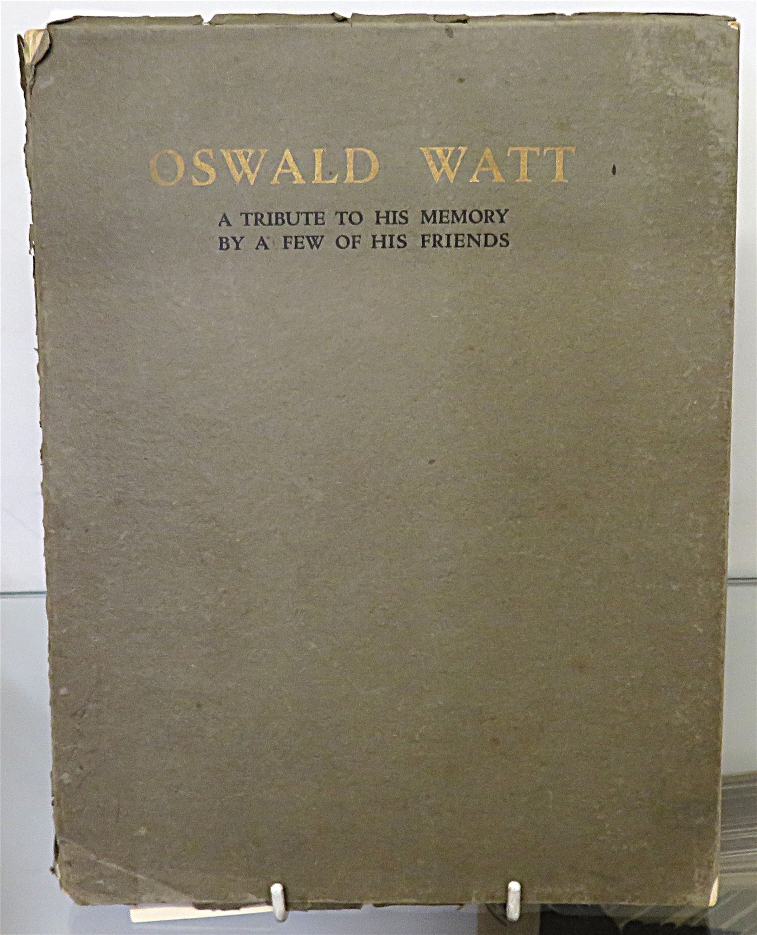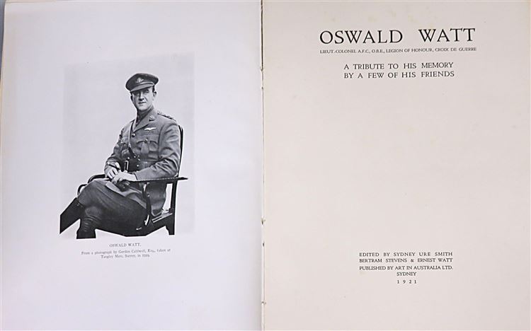 St Mary's Books is proud to present this 1921 limited edition copy of "Oswald Watt: A Tribute to his memory by a few of his friends", edited by Sydney Ure Smith, Betram Stevens and Ernest Watt. Bound in olive green paper with gold gilt and black ink lettering, this softcover book contains 69 pages of text peppered with black and white photographs. This book provides an intimate tribute to Oswald Watt's life, from his early days to his service in the war, to his very last words. This copy is in good condition - though the cover is bumped and worn and there is some splitting to the hinges on the spine, the interior remains clean and readable. "Oswald Watt" is looking for a new home and would make for a perfect gift for anyone hoping to understand the great war from a more personal perspective.