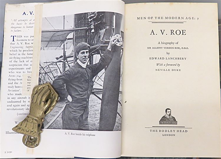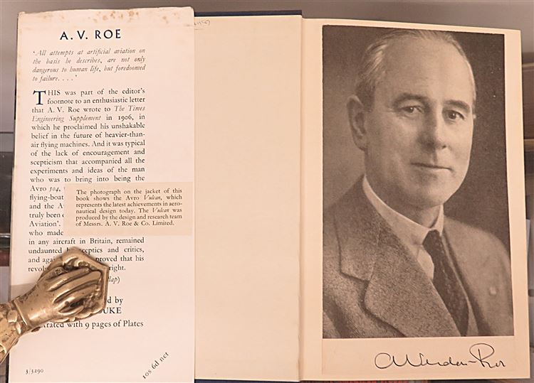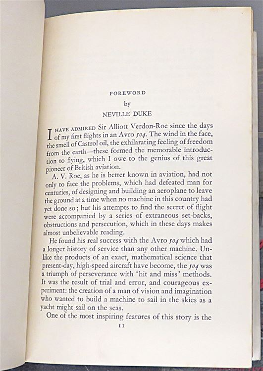 Hardback. A First Edition copy signed by Sir Alliot Verdon-Roe, a pioneer of British Aviation, to the front free endpaper. This copy is complete with an unclipped dust jacket over blue cloth boards. The book is illustrated with several black and white photographic images, including a frontispiece. Overall a very good copy with the pictorial dustjacket showing just a lttle edge wear, foxing and a closed tear to the rear, The pages within are clean despite the very occasional spot of foxing. There is a black and white clipping of Sir Alliot Verdon-Roe which has been pasted onto the front free endpaper with his signature to the base. pp. 140 + 3. With a foreword by Neville Duke. This biography by Edward Lanchbery details the life of Sir Verdon-Roe from his early experiments with flight, through his struggles to establish a manufacturing industry, and his role into developing iconic aircraft.