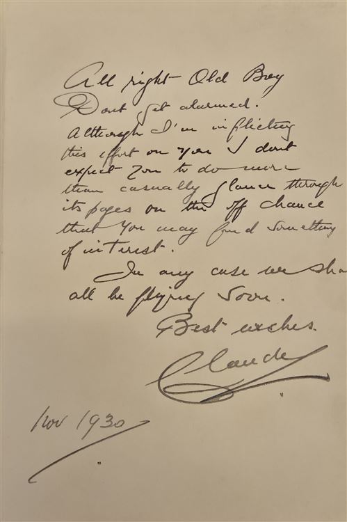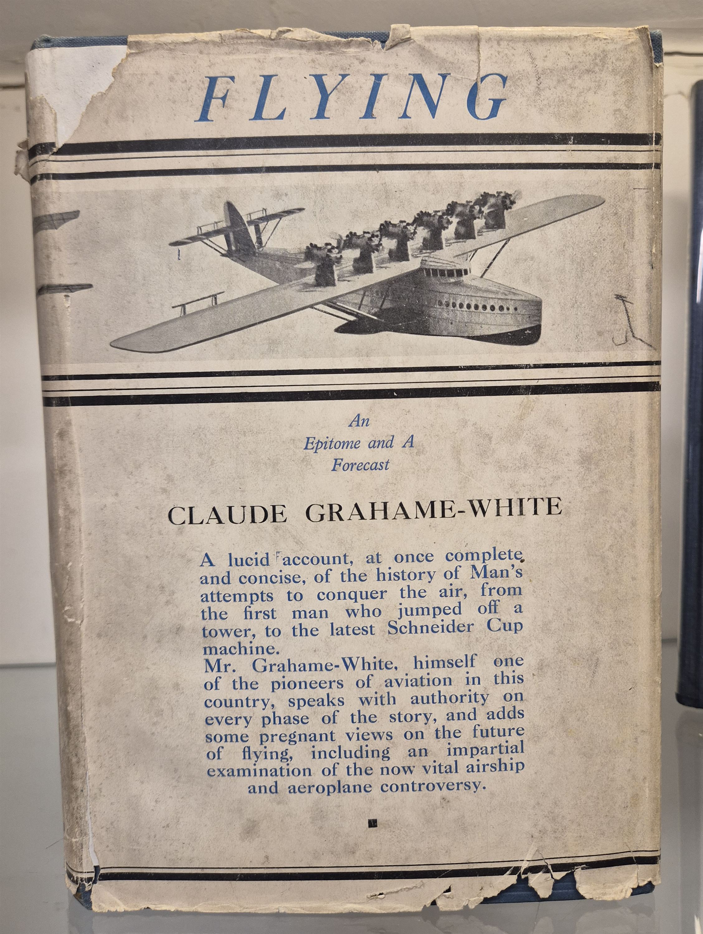 A lucid account, at once complete and concise, of the history of Man's attempts to conquer the air, from the first man who jumped off a tower, to the latest Schneider Cup Machine. Mr Grahame-White, himself one of the pioneers of aviation in this country, speaks with authority on every phase of the story, and adds some pregnant views on the future of flying, including an impartial examination of the now vital airship and aeroplane Controversy. This signed copy by the Author, with a large dedication to the front free endpaper, which starts with "All right old Boy" and talks about the book just written, signed and dated Nov 1930.Blue cloth very good, 263 pp with original dust jacket, showing chips and some restoration with some small loss to the front, A fascinating early volume looking at flight. Scarce with jacket and signature.