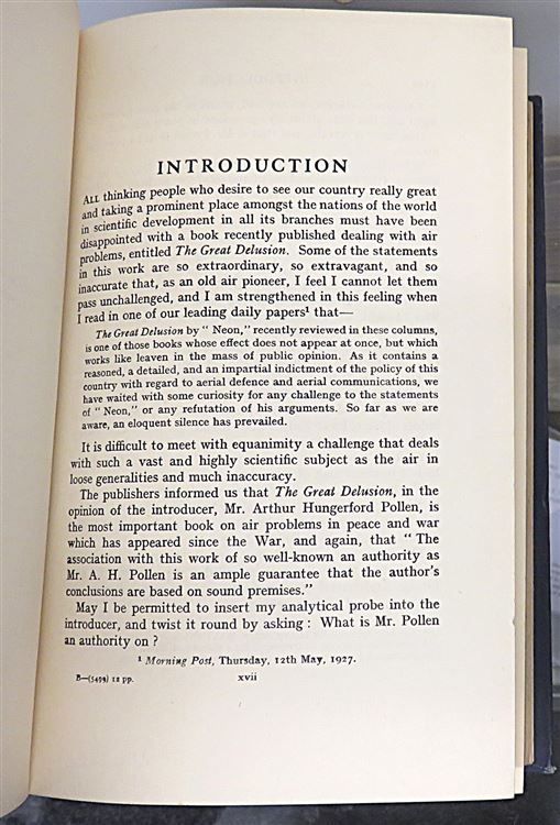 Hardback. A 1928, First Edition copy of Rear Admiral's Murray F. Sueter's critical defence of British air power policy, acting as a direct rebuttal to the book The Great Delusion by the Pseudonym Neon. Handsomely bound in full navy cloth in near pristine condition despite minor fading to the spine. Internally the text block is tight and the pages are very clean despite the very occasional spot of foxing. Illustrated with 60 plates in monochrome, four of which are folding, three coloured plates and a folding diagram to the rear. pp. pp.xxvii + 448 + 10. A must for any aviation enthusist.