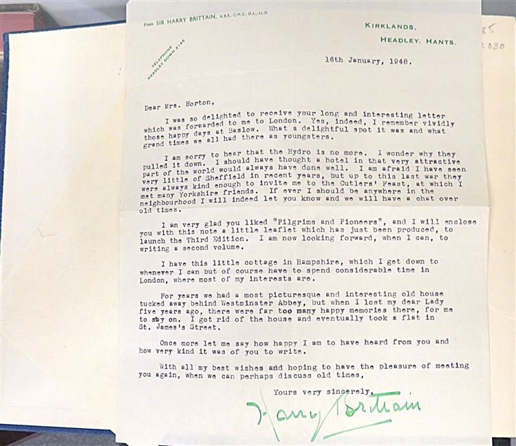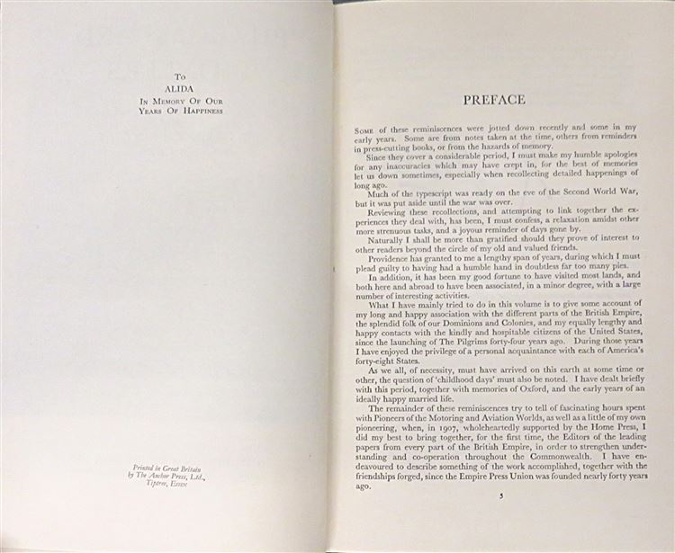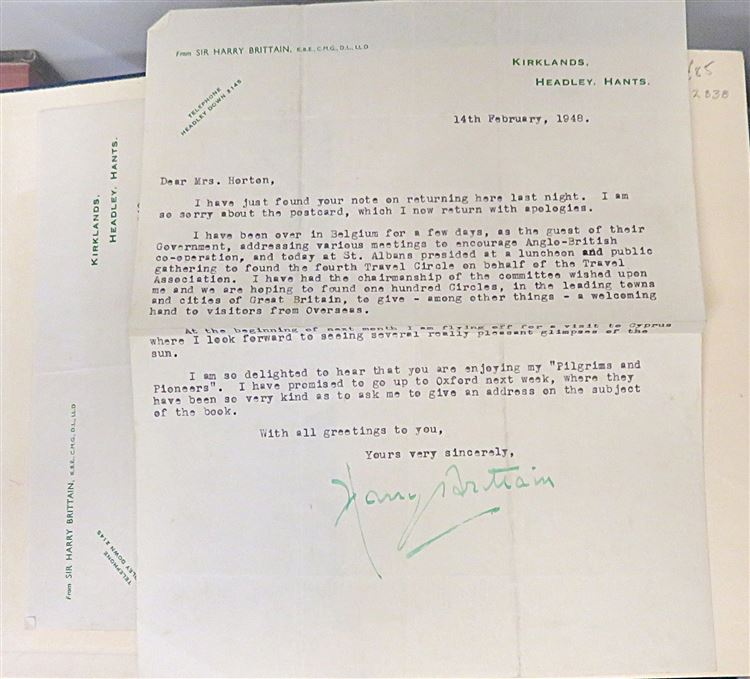 St Mary's Books is proud to present the third edition of "Pilgrims and Pioneers: Reminiscences of Sir Harry Brittain", accompanied by two original letters signed by the author in January and February 1948. Housed in its original cream and red dustjacket featuring a facsimile of Brittain's writing in his signature green ink, this hardback book is bound in navy cloth with gold gilt lettering to the cover and spine. Inside, one finds 285 pages of text peppered with black and white photographs and facsimile writings, recalling the life of this great public persona and ceaseless advocate for aviation. This edition, and the enclosed letters, are in good condition. The dustjacket can unfortunately only be described as fair to good due to the significant losses it has suffered, and the cloth on the book itself is waving. However, this text remains clean and readable. "Pilgrims and Pioneers: Reminiscences of Sir Harry Brittain" is looking for a new home and would make for the perfect gift for any lover of a varied memoir, or any aviation enthusiast.