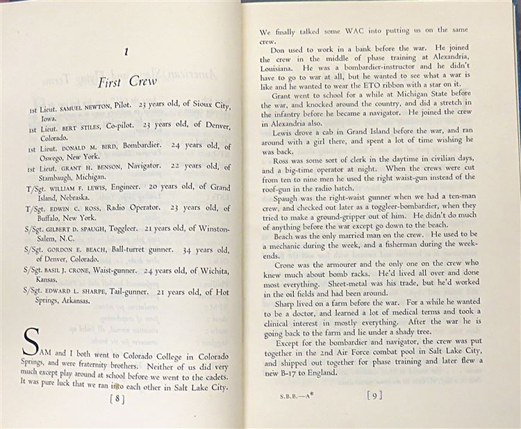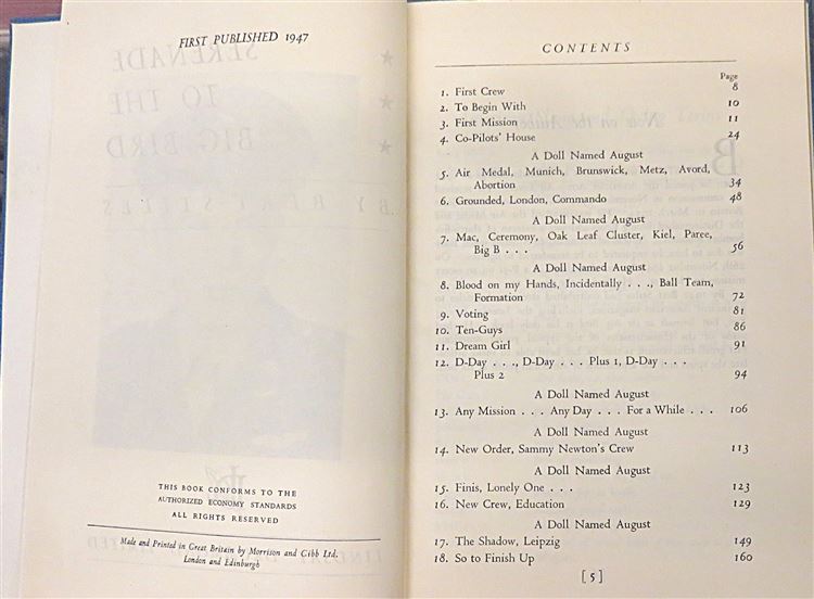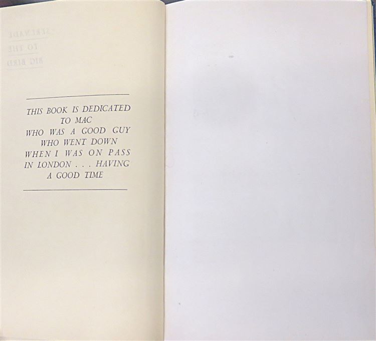 St Mary's Books are proud to present this 1947 first edition of "Serenade to the Big Bird" by Bert Styles. Housed in its original blue dustjacket featuring a stunning illustration of the wings of an aeroplane merging into bird wings, this hardback book is bound in blue cloth with a lovely silver gilt illustration of an aeroplane on the cover and silver gilt lettering to the spine. Inside, one finds 160 pages of Bert Stiles' reminiscences - a member of the American Air Force and a winner of the Air Medal and Distinguished Flying Cross, his writing style has been described as sensitive, humorous, and lacking sentimentality. This copy, and its original dustjacket, are in excellent condition - one can hardly believe that they are from 1947. This book has been impeccably well preserved, and is now looking for a new home where these stories which "make articulate the spirit and the aspirations of American youth at its best" can be enjoyed.