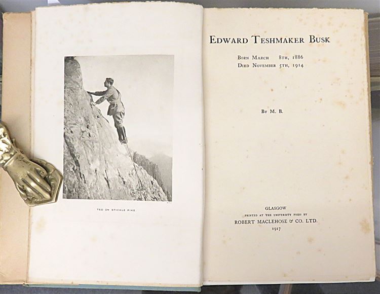 Hardback. A 1917, First Edition copy, complete with it's dust jacket and small memorial booklet and facsimile letters from Edward Teshmaker Busk within, including a letter from the author, aged 14 titled "Model Submarine Boats". The dust jacket has discoloured with wear and small pieces missing to the extremities. Underneath lie blue paper covered boards which are a little discoloured to the extremities and spine, although it still presents well. Fore-edge untrimmed. The pages are a little foxed throughout, although the pages are generally clean. Small book-plate to the front paste-down. Illustrated with several photographic images. pp. 92. Edward Teshmaker Busk was an English pioneer of early aircraft design, and the designer of the first full sized efficient inherently stable aeroplane. This book is a touching tribute written by Mary Busk, Edward Teshmaker Bush' mother. A scarce title especially with the dust jacket.