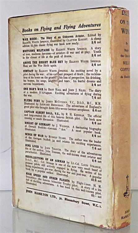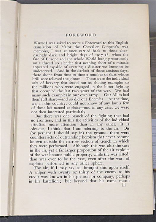 Hardback. Translated from the French by A.J. Insall. A scarce title, complete with a facsimile dust jacket. A detailed memoir of Major Willy Coppens, the top Belgian World War I flying ace, known as the "Balloon Buster". The facsimile dust jacket is in a very good clean condition. While underneath the black cloth boards show some edge wear. The pages within are lightly toned although very clean throughout, illustrated with several photographic images. pp. xv + 290 + 28. Overall a good copy, a must for any aviation enthusiast.