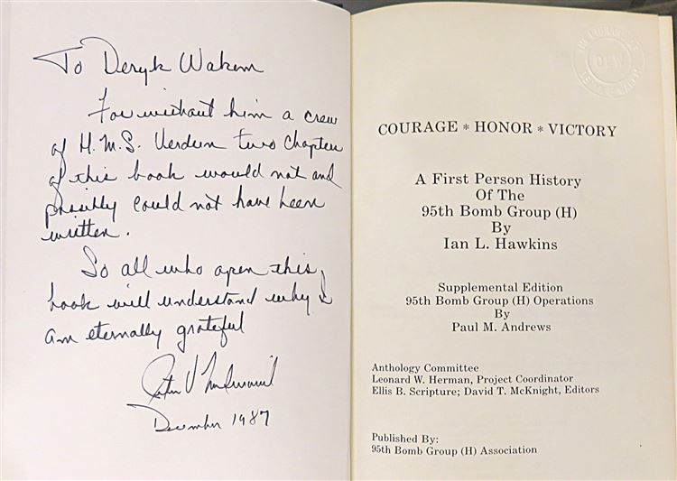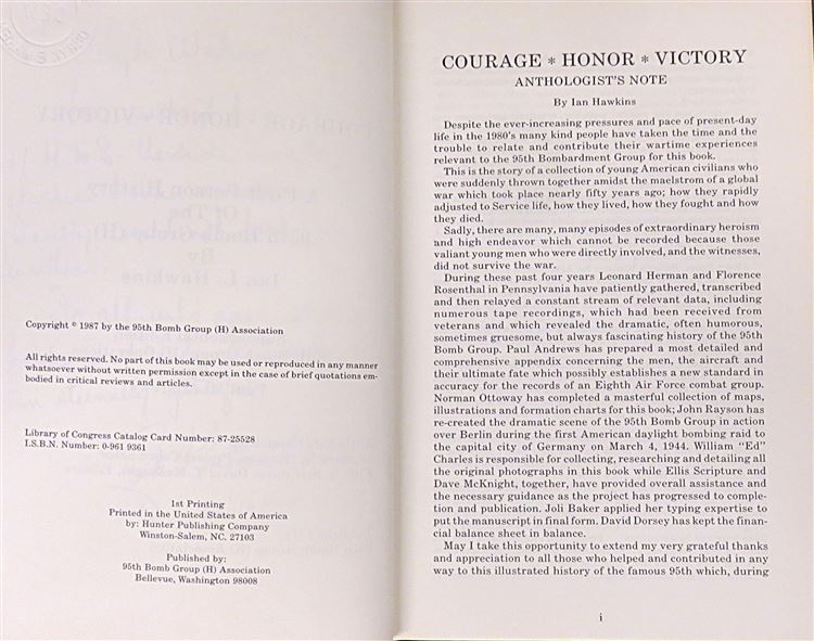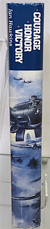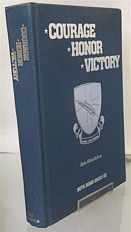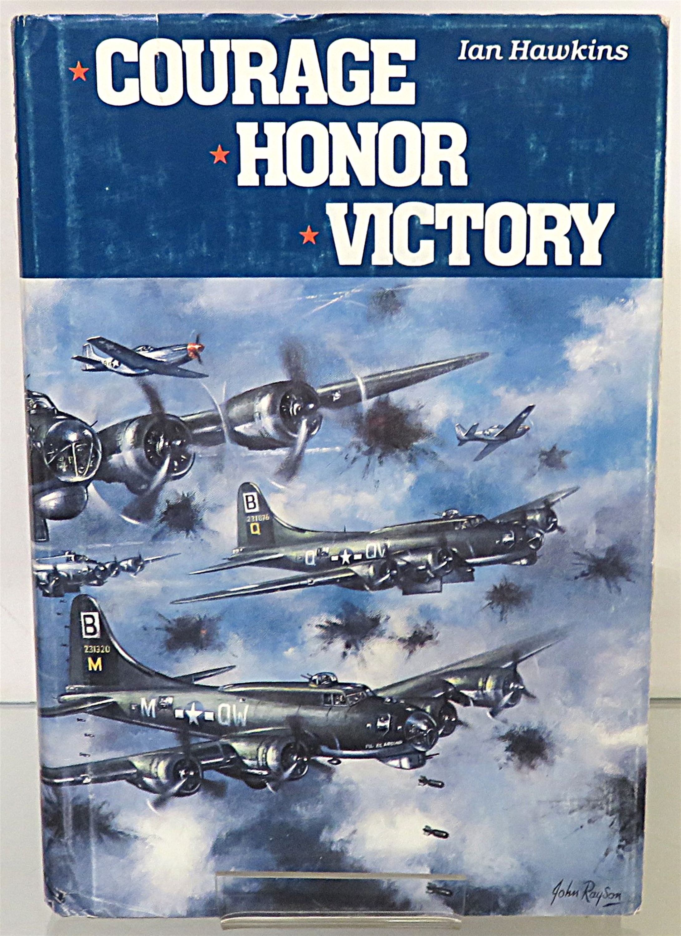 St Mary's Books is proud to present this 1987 first edition of "Courage Honor Victory" by Ian Hawkins, featuring a Captain's inscription dedicating the book to Deryk E Wakem. Housed in its original blue dustjacket featuring a stunning painting of the 95th Bomb Group, this hardback book is bound in blue-grey cloth with silver gilt lettering on the cover and spine. Inside, one finds i-xiii and 344 pages of text, supplemented with contemporary black and white photographs. This book is a fascinating anthology providing a first person history of the 95th Bomb Group (H), filled with the first-person accounts of various members and ex-fighters. This copy, and its original dustjacket, is in very good condition - other than some minor scuffing on the dustjacket and Deryk Wakem's ex-libris embossment on the prelims, this edition has been remarkably well preserved. "Courage Honor Victory" is looking for a new home and would make for a perfect gift for any military aviation enthusiast.