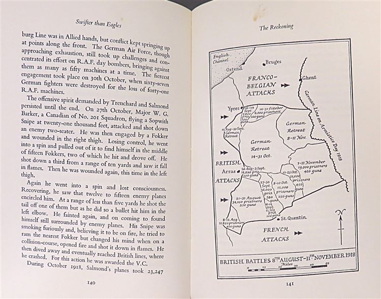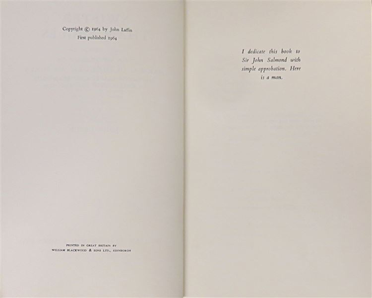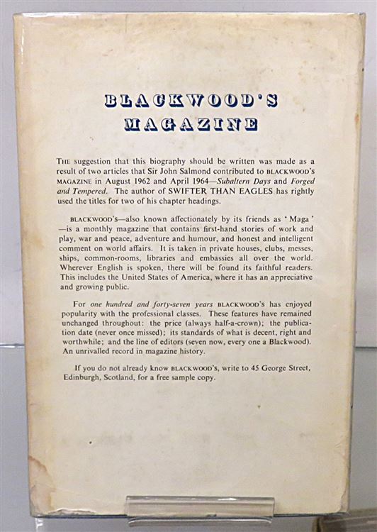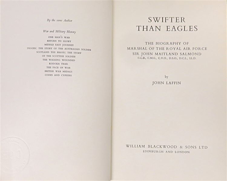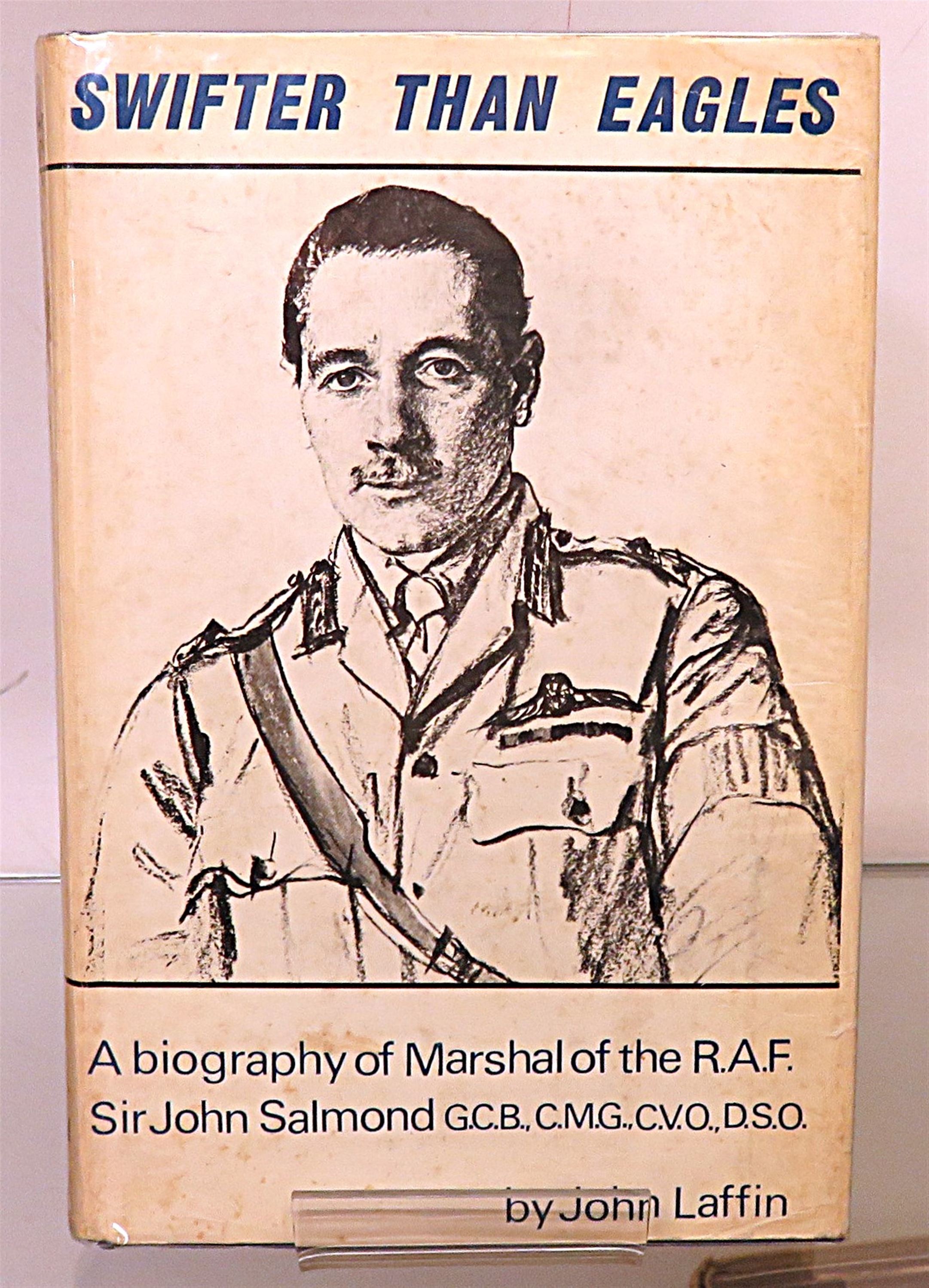St Mary's Books is proud to present this 1964 first edition of "Swifter than Eagles: A biography of Marshal of the RAF Sir John Salmond" signed by the author, John Laffin. Housed in its original cream dustjacket featuring a lovely illustration of Sir Salmond, this hardback book is bound in blue cloth with gold gilt lettering on the spine. Inside, one finds i-xii and 278 pages of text peppered with stunning black and white photographs and illustrations. This book treats its reader to the inspiring story of the youngest ever member of the Army Council and the man who helped ensure the continuance of the RAF in the interwar years. This book is in very good condition, with few notable blemishes or imperfections to the book itself or the original dustjacket. Other than a Cross & Crockade International ex-libris paste down on the front free endpapers and an ex-libris embossment on one of the prelims pages, this book has been immaculately preserved. "Swifter than Eagles" is looking for a new home and would make for the perfect gift for any aviation enthusiast.