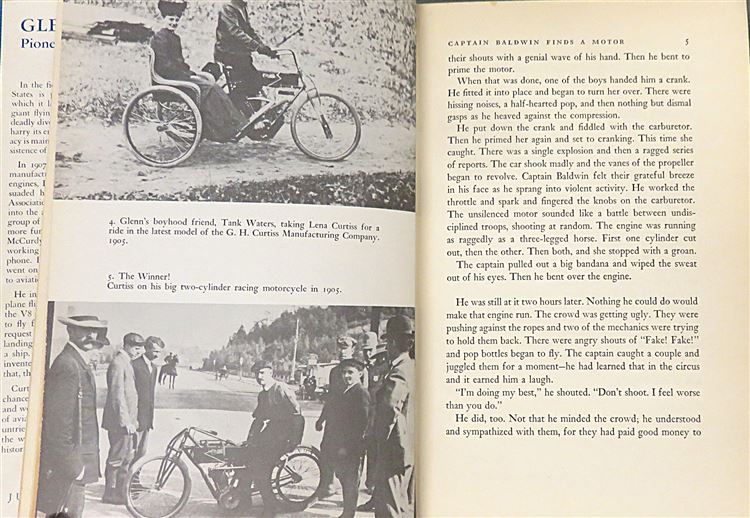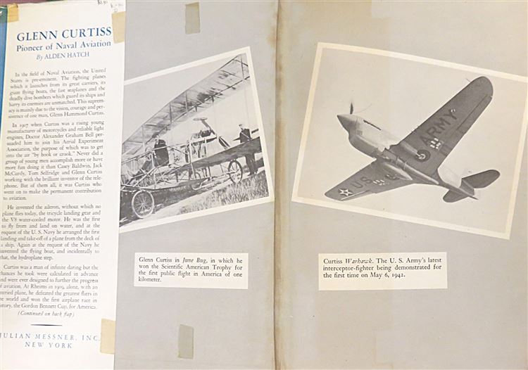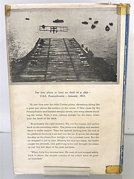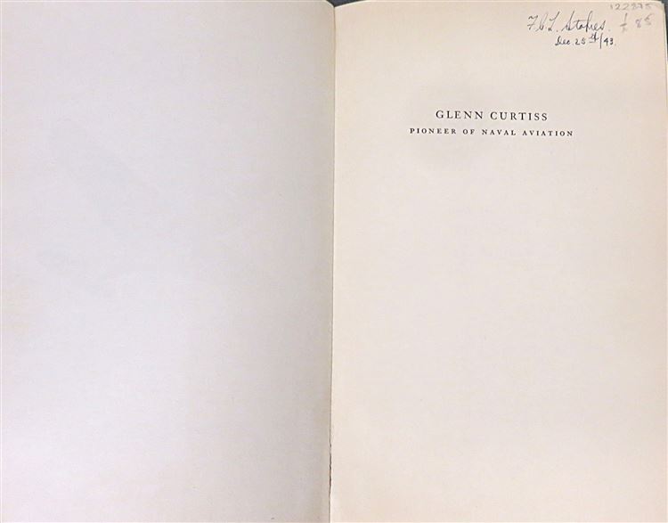 This lovely 1942 first edition of "Glenn Curtis: Pioneer of Naval Aviation" is housed in its original blue dustjacket featuring charming illustrations of naval aeroplanes, and a striking image of Glenn Curtis. Bound in light blue cloth with navy ink lettering, this hardback book contains i-x and 294 pages of text peppered with contemporary black and white photographs and detailing the extraordinary life of this great inventor and adventurer. In these pages, readers are treated to the intimate details of the life and journey of Glenn Curtis - the man whom is credited with single-handedly ensuring the supremacy of the United States in the field of Naval Aviation through his calculated daring feats. This copy is in good condition - though the dustjacket is bumped and has been repaired with tape, the boards of the book are slightly stained, and there is some minor offsetting to the pictorial front free endpapers - this copy remains in good condition given its age and rarity. "Glenn Curtis: Pioneer of Naval Aviation" is looking for a new home and would make for the perfect gift for any aviation enthusiast or lover of an exciting biography.