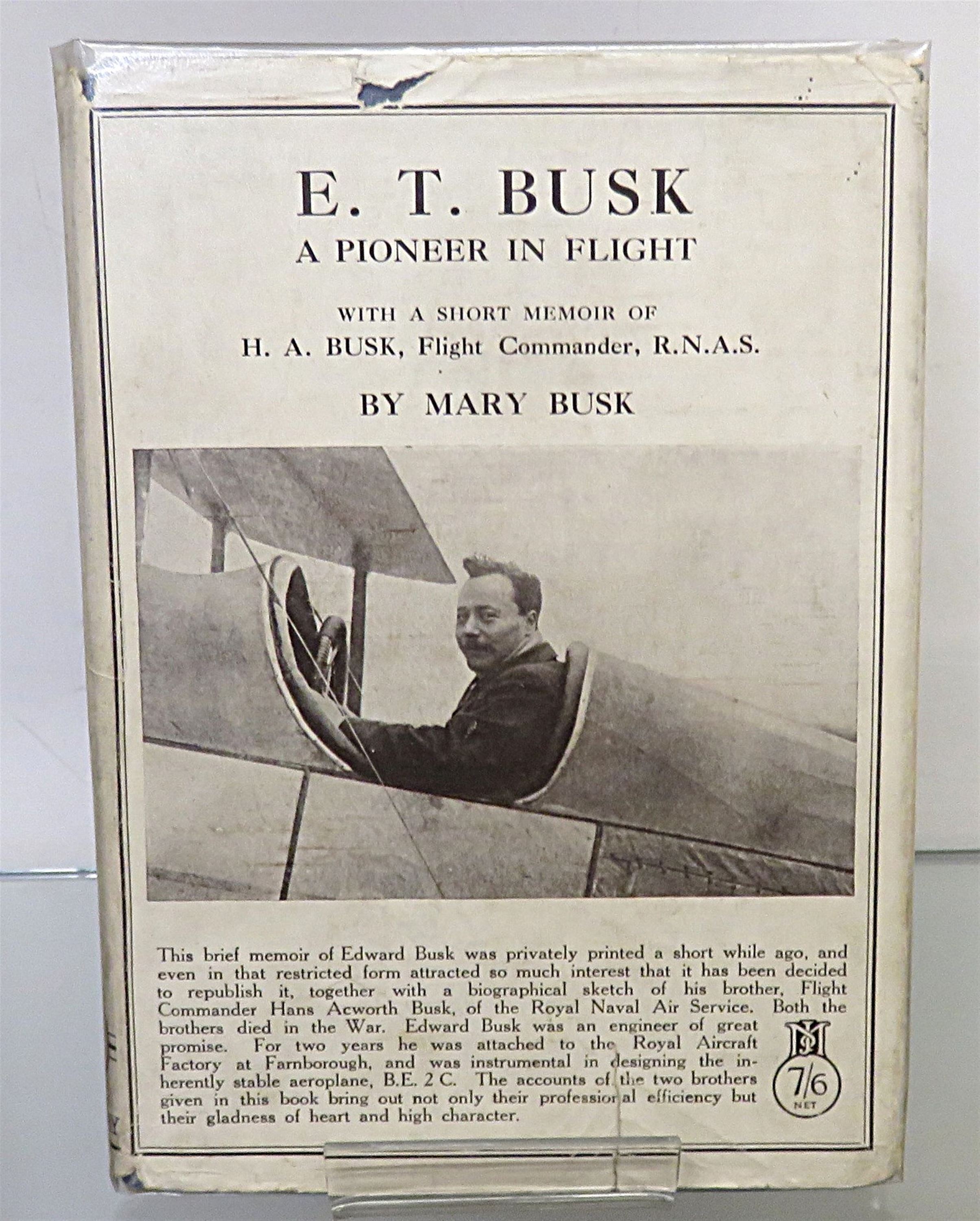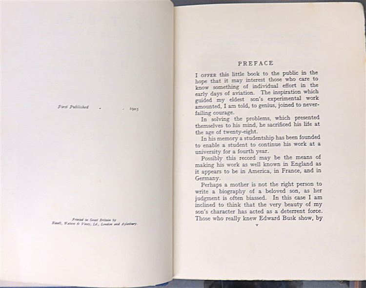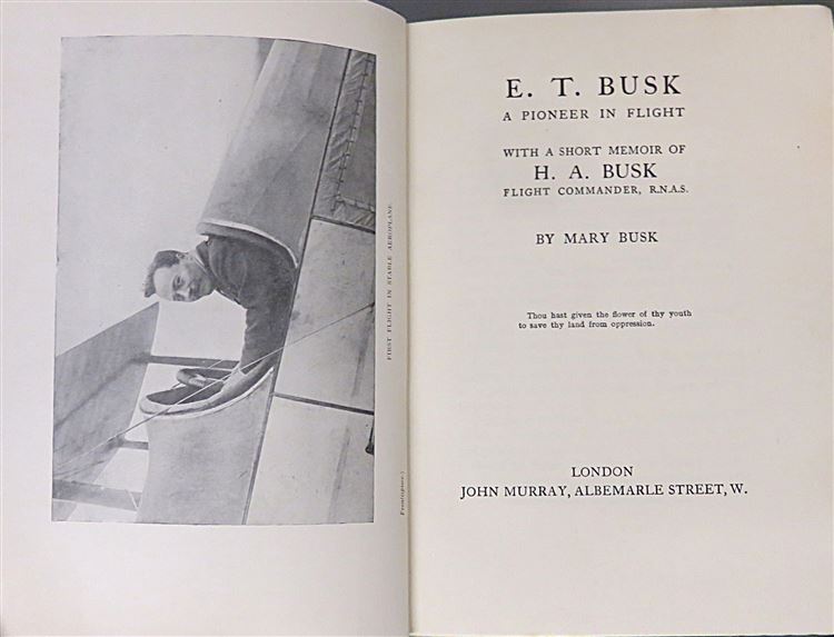 Hardback. A 1925 First Edition title complete with it's dust jacket. This copy also has a slip of paper loosely inserted into the book, with an embossed address in Sussex to the top with the words " With kind regards " from M. Busk. The dust jacket does show a little wear and light discolouration although rare to find complete with it's dust jacket. Underneath lie rich blue cloth boards with light bumping to the corners and spine, however it is showing very little other wear. The pages are remarkably clean given the books age, although there is some pencil notation to page 70. Illustrated with several black and white photographic images. pp. 167. A biographical work in tribute to her two sons, Edward Teshmaker Busk and Hans Ackworth Busk, both of whom were pioneer aviators who lost their lives during the early years of powered flight and World War I.