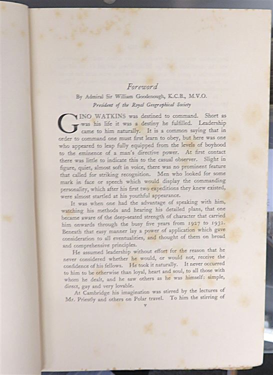 Hardback. A 1932 First Edition copy complete with it's dust jacket. This is a detailed account of a privately funded expedition to East Greenland led by Gino Watkins. As the expedition's ski expert and naturalist, Chapman provides a firsthand narrative of the team's efforts to map uncharted coastlines, study climate data, and test flying routes during the North Polar winter. This copy is complete with it's dust jacket, although it is worn with large parts missing. The blue cloth boards are in good condition despite fading to the spine. There is foxing to the prelims and occasionally throughout, although the pages are generally very clean. Illustrated with maps and 64 pages of plates. pp.xv + 304. Overall a good copy of classic Arctic exploration literature.