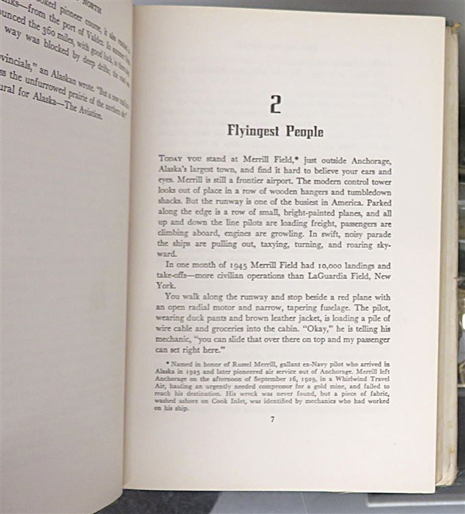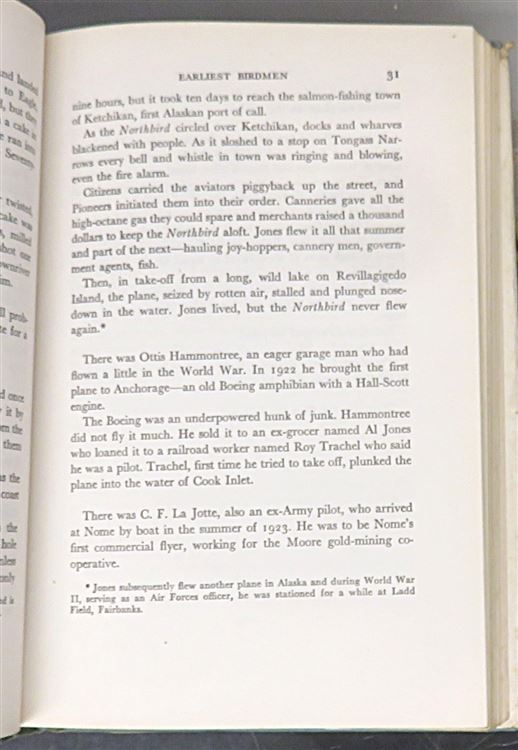 Hardback. A rare First Edition copy complete with it's dust jacket. This is the story of conquest. It is the story of the amazing and amusing exploits of those famed flying heroes, the "bush pilots" of Alaska. Jean Potter tell for the first time the life of flight of airmen like Carl Ben Eielson, Joe Crosson, Bob Reeve and the world's craziest pilot Archie Ferguson. Her book is illustrated with photographs from the pilots' personal albums. This copy, although complete with it's dust jacket, it is worn with pieces missing. The blue cloth boards underneath, however, are in good condition. The pages are very clean throughout. pp. xiv + 261. Overall a fascinating account of the Alaskan pioneer pilots who "flew by the seat of their pants".