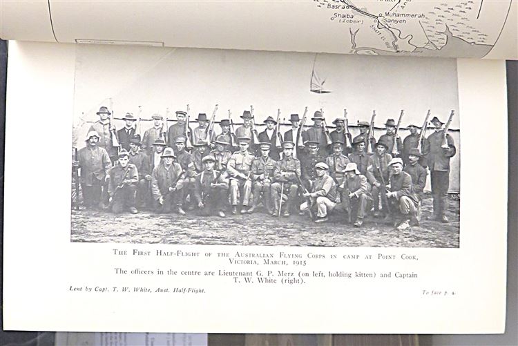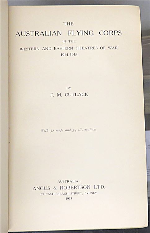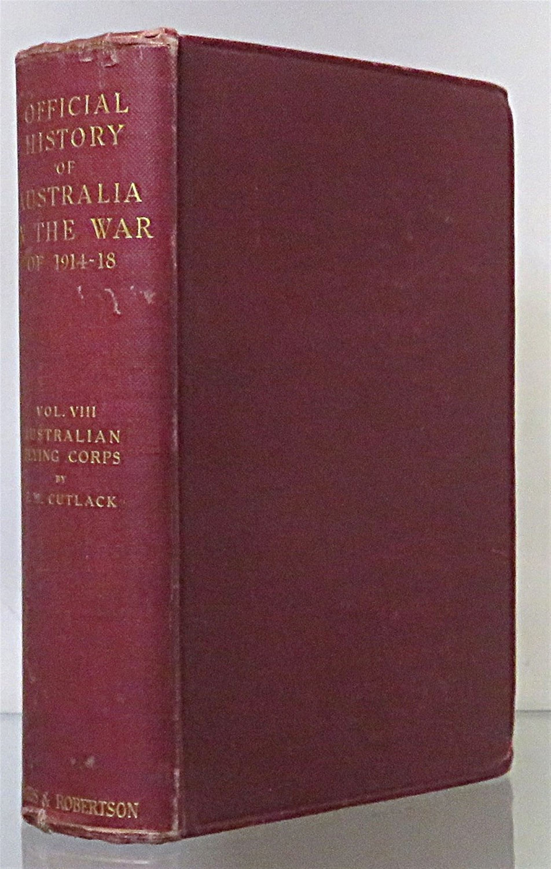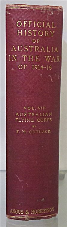 Hardback. A 1933 Second edition, and part eight of The Official History of Australia in the war of 1914-18. This copy bound in burgundy cloth with bright gilt titles to the spine. The binding is overall in good condition despite a little bumping to the corners. There is a slight lean to the spine as well as a closed tear along the base. Internally the pages are very clean, illustrated with several plates in monotone and maps. pp. xxvii + 485. This edition documents the AFC's operations in France and the Middle East, highlighting No. 1's Squadron in Palestine and 1917-18 actions on the Western Front.
