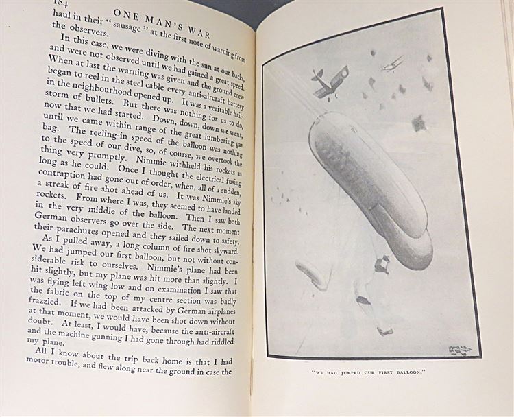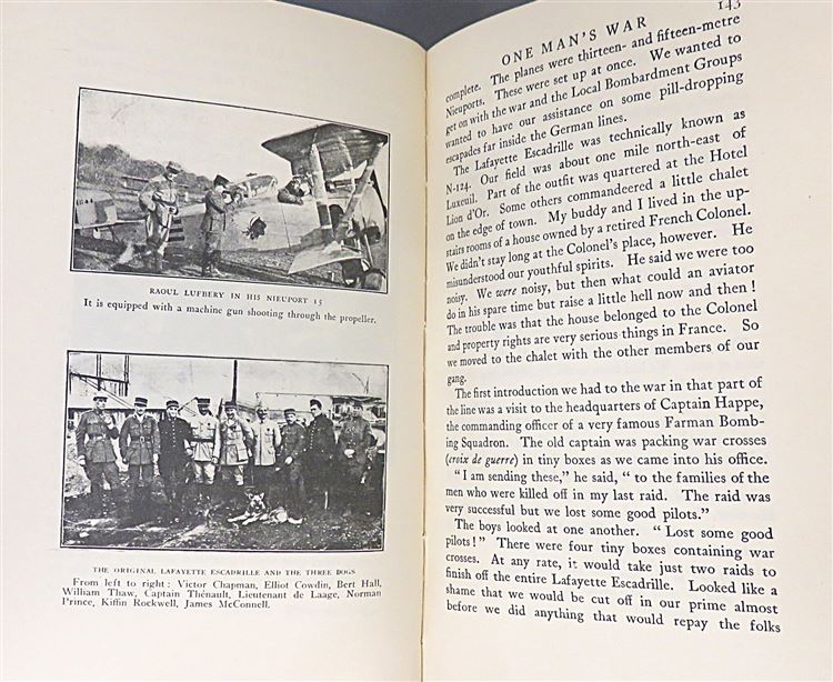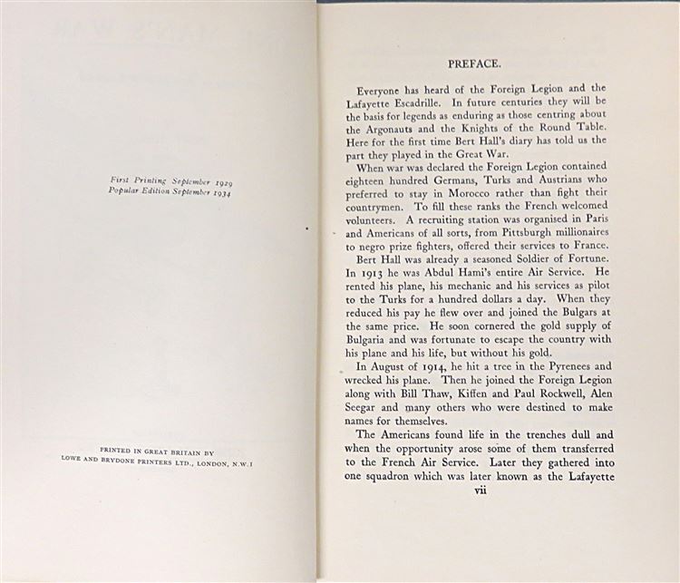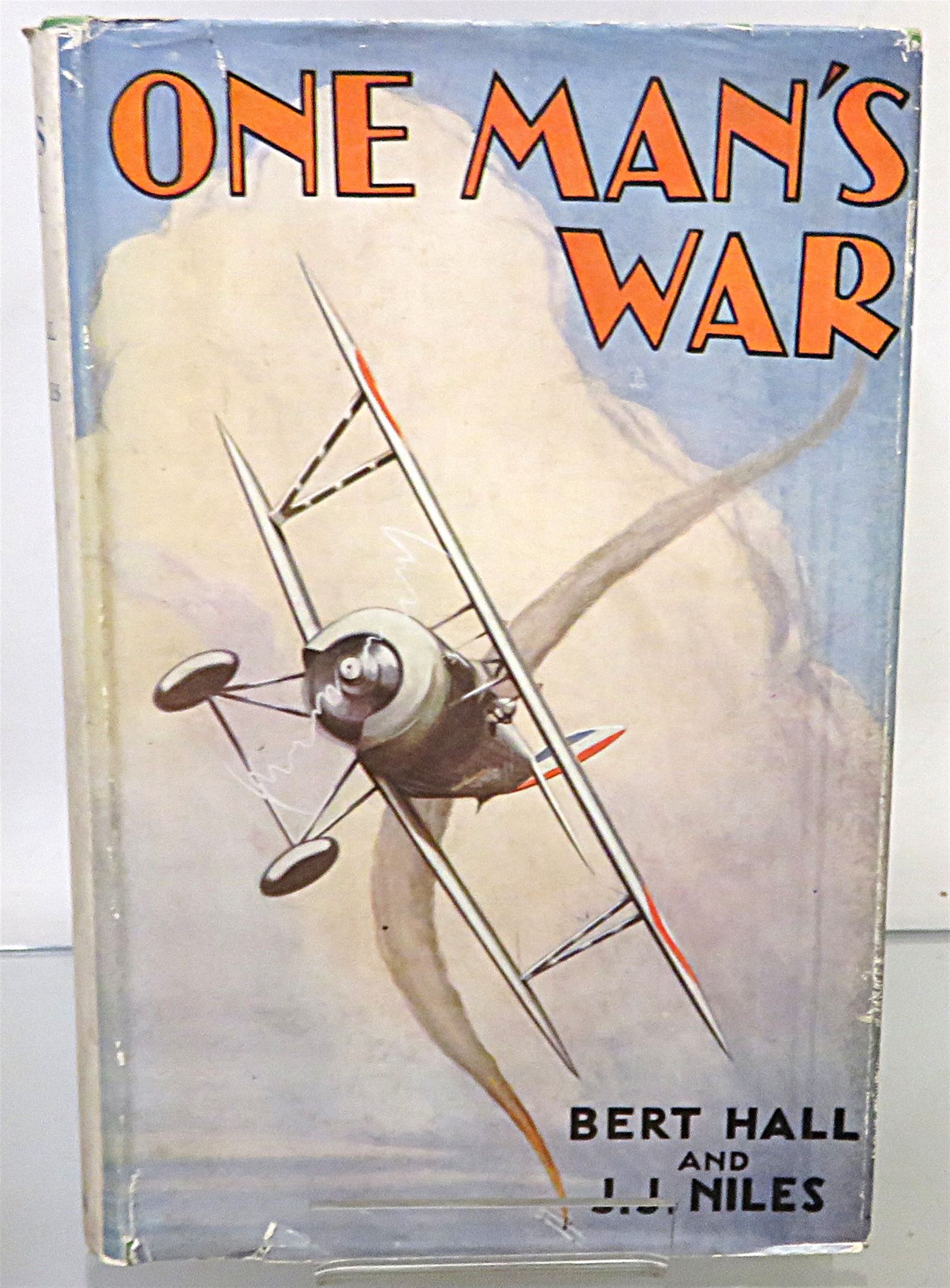 St Mary's Books is proud to present this 1934 popular edition of "One Man's War: The Story of the Lafayette Escadrille" by Bert Hall and J. J. Niles. Housed in its original pictorial dustjacket featuring a beautiful illustration of an aeroplane soaring through the clouds, this hardback book is bound in green cloth with black ink lettering to the spine. Inside, one finds i-ix and 384 pages of text peppered with full-page black and white and colour images. Within the pages of this book, the reader is treated to Lieutenant Bert Hall's wartime diary, detailing his varied experiences in France, in the Balkan War, in the Great War, in Russia and in Romania. This copy, and its original dustjacket, are in very good condition - with few notable blemishes or imperfections they appear as new. "One Man's War" is looking for a new home and would make for the perfect gift for any aviation enthusiast looking to read a thrilling and varied first-hand wartime account.