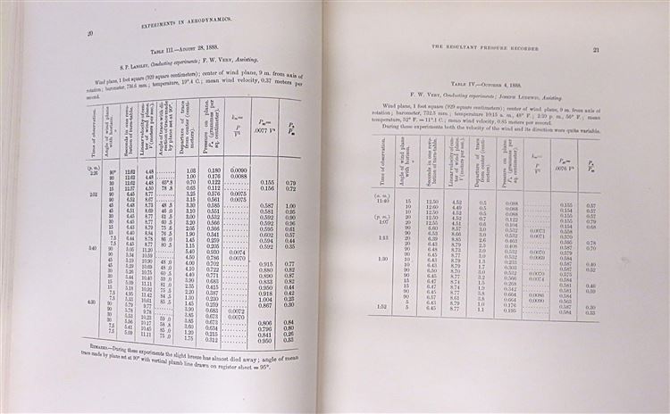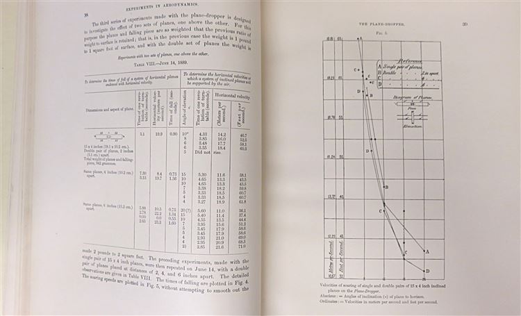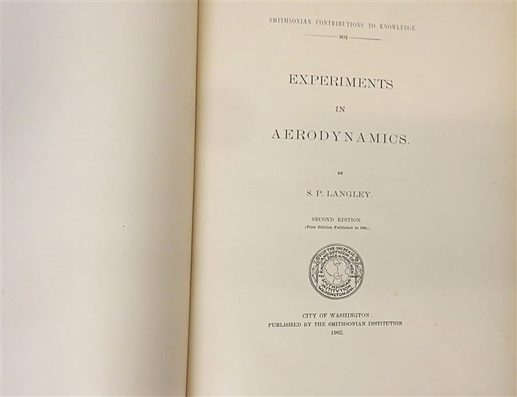 St Mary's Books is proud to present this 1902 second edition of "Experiments in Aerodynamics" by S. P. Langley. Handsomely bound in olive green cloth with gold gilt lettering, this hardback book contains 114 pages outlining Langley's early experiments into aerial flight and motion. This seminal scientific text is supplemented by tables of data, graphs, and illustrated plates to the back of the book. This copy is in very good condition wiht