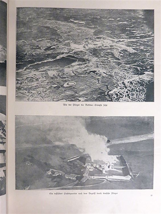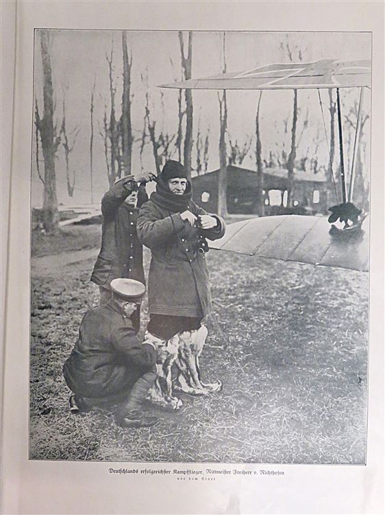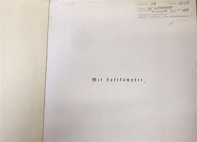 St Mary's Books is proud to present this 1918 illustrated edition of "Wir Luftkampter. Bilder und Berichte Deutscher Flieger und Luftschiffer". This paperback book has a striking pictorial cover featuring a soldier staring directly back at the reader. Inside, one finds 62 pages of text complete with stunning early aerial photographs and images of pilots and engineers, complete with details written in German. This copy is in very good condition, with few notable imperfections other than an ex-libris paste down on the front free endpaper indicating this copy once belonged to Herbert Tonnies. Other than that, the paper cover is creased and bumped along its edges. However, for a paperback book that is over 100 years old, this copy remains remarkably well preserved. "Wir Luftkampfer" is looking for a new home and would make for the perfect gift for any collector interested in early German aviation.