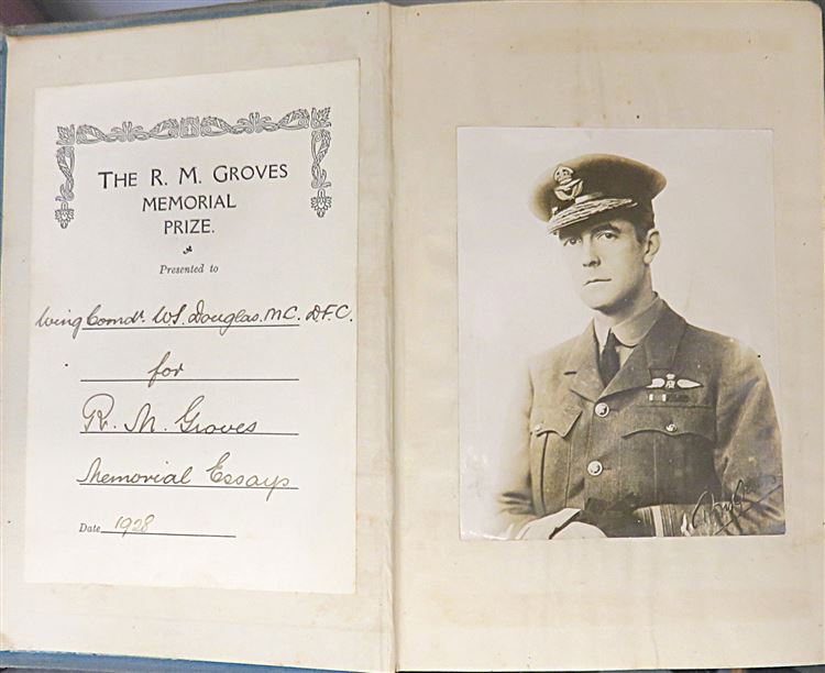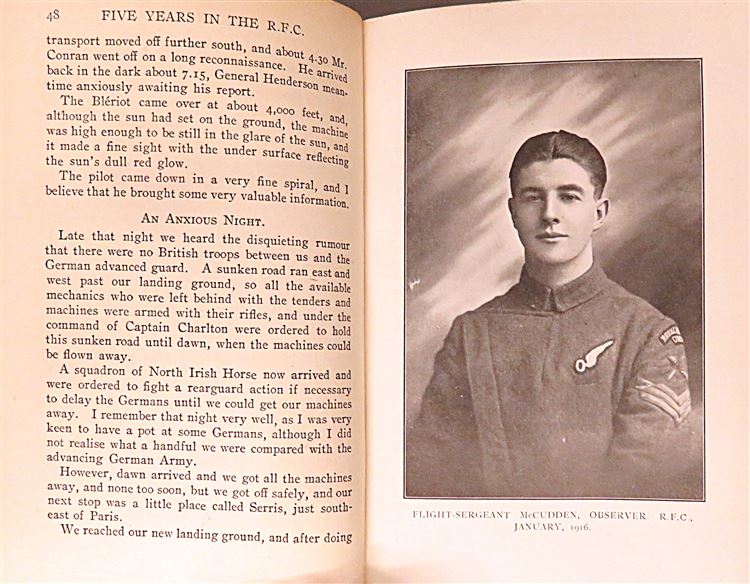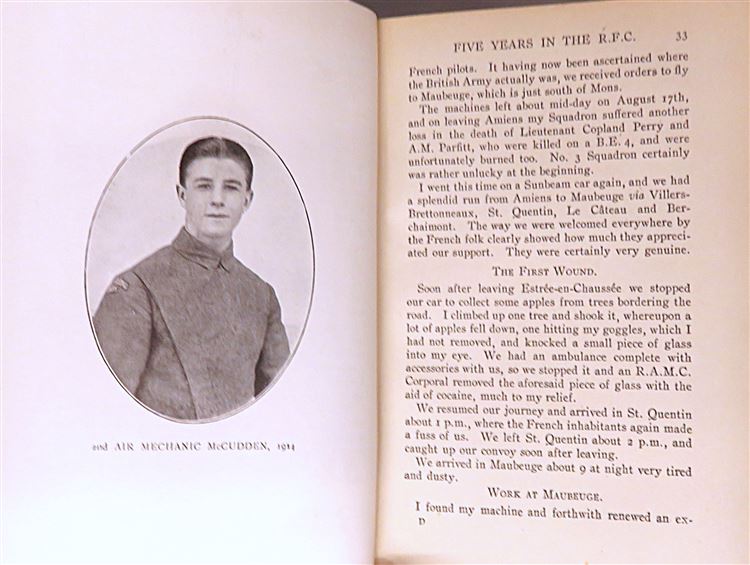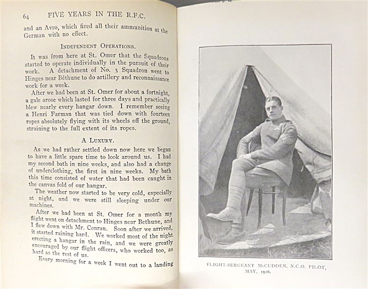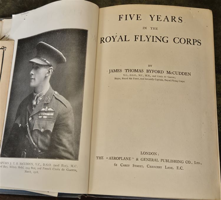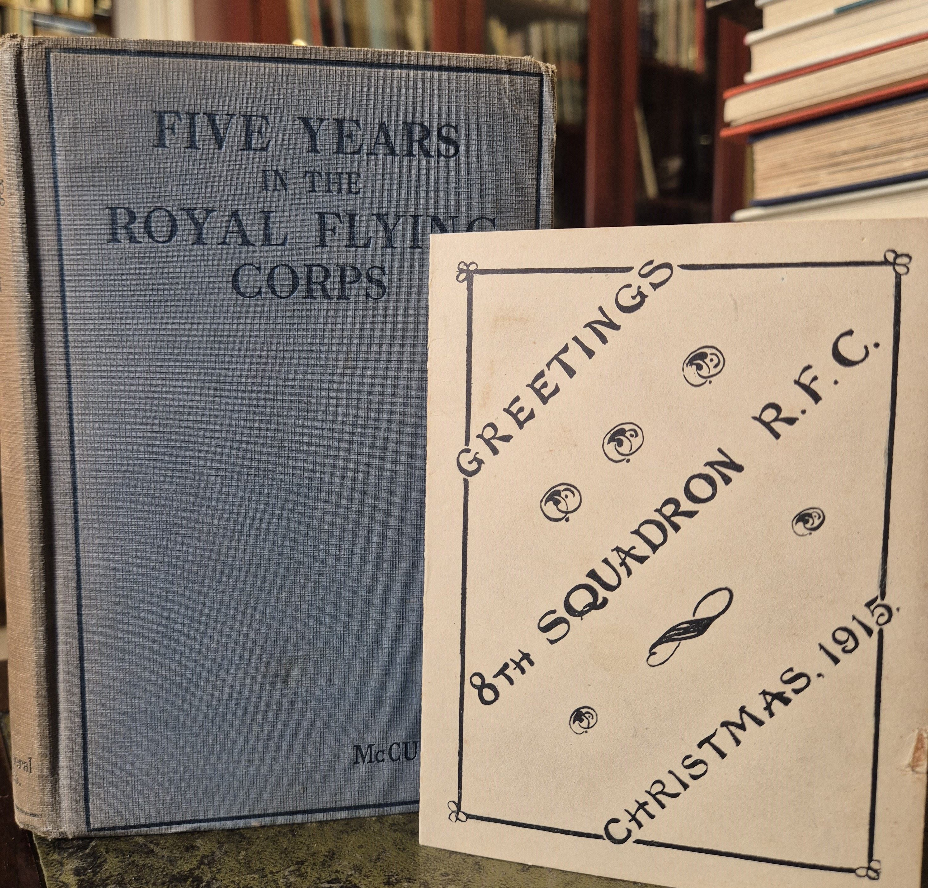 St Mary's Books is proud to present this 1918 first edition of "Five Years in the Royal Flying Corps" by James Thomas Byford McCudden. Bound in blue cloth with navy lettering on the cover and spine, this hardback book contains i-xvi and 348 pages of text detailing McCudden's wartime aviation experiences and peppered with black and white photographs of the author and his peers. Within the pages of this book, the reader is treated to the first-hand account of a British WW1 ace, and his journey from an aircraft mechanic in 1913 to a highly decorated pilot and flight commander, including his strategies and thoughts on the future of aviation. This book was published posthumously after McCudden was tragically killed in a flying accident caused by engine failure, and comes alongside an R.F.C Christmas Card from 1915. This particular copy is in very good condition - though the cloth on the boards is faded, and there is a "1928 R. M. Groves Memorial Prize" paste-down on the free endpaper, alongside an image of R. M. Groves, a fellow aviator and Deputy Chief of the Air Staff. However, the interior of this copy remains bright, clean and readable. "Five Years in the Royal Flying Corps" is looking for a new home and would make for a perfect gift for any aviation enthusiast.