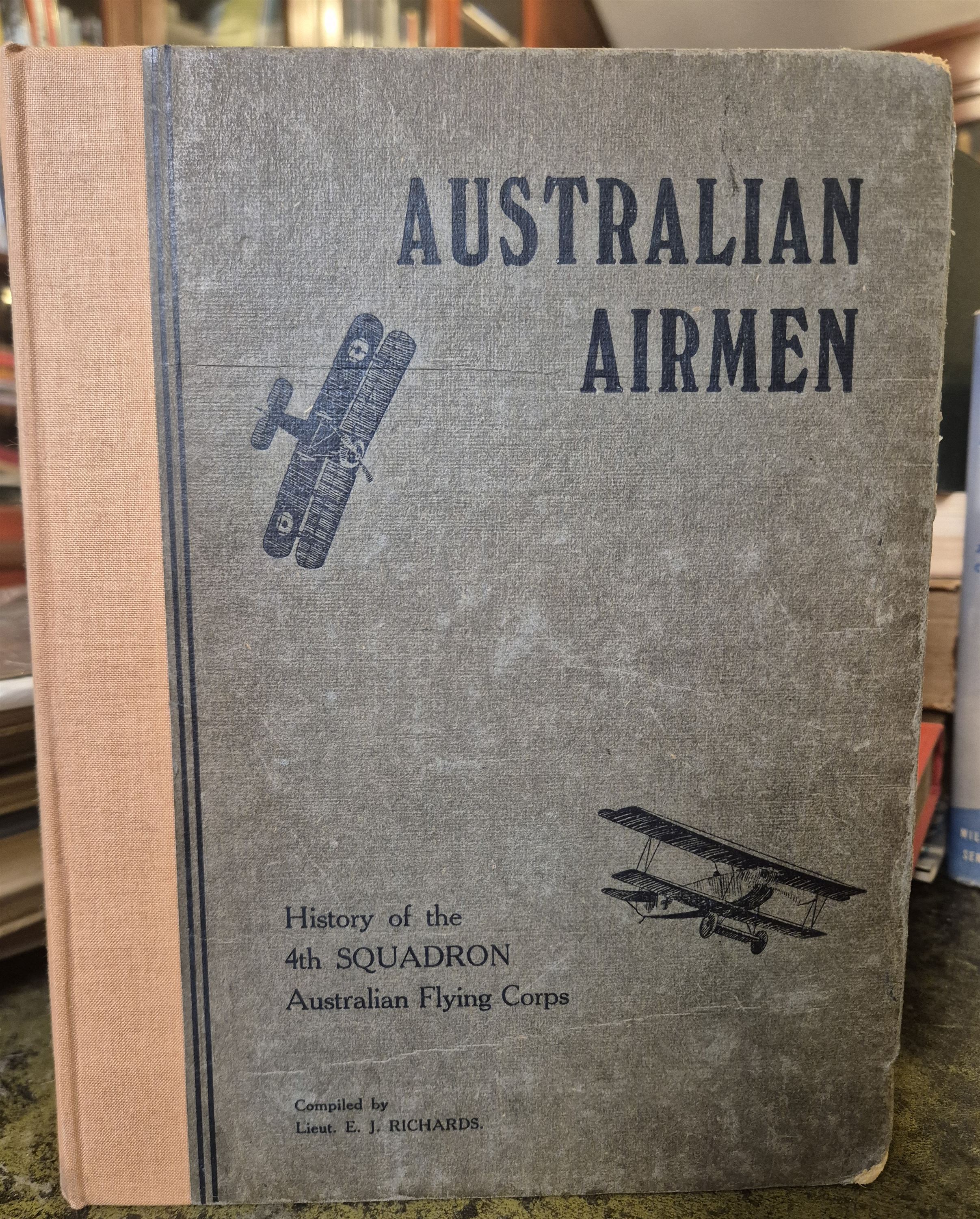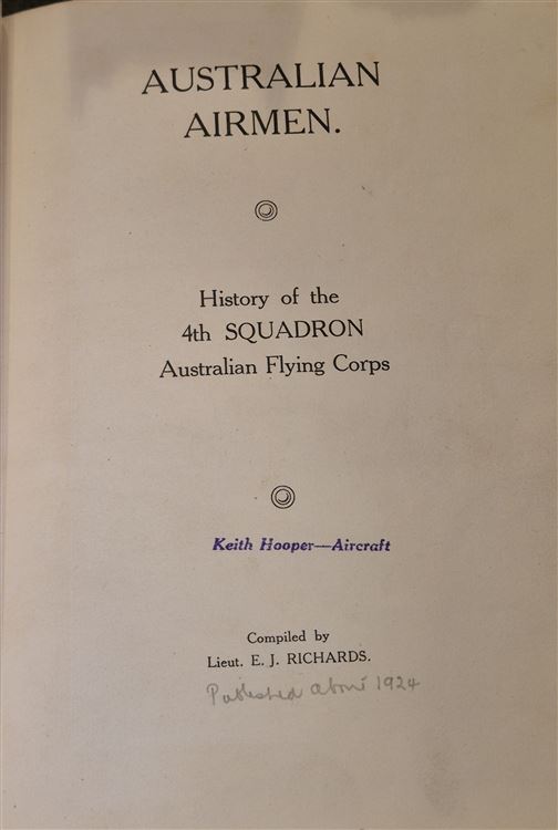 This work is regarded as one of the rarest and most sought-after Australian unit histories from the First World War. Compiled by Lieutenant E.J. Richards, it provides a primary-source account of No. 4 Squadron, AFC, the final Australian flying unit formed during the war.Operational History: The volume chronicles the squadron's journey from its 1916 formation at Point Cook, Victoria, through training in England (where it was briefly designated 71 Squadron, RFC), to its distinguished service on the Western Front beginning in December 1917. This copy has been rebacked with a new spine, the orginal front and rear boards present. 80 pp. Part of a major aviation book collection now being sold by St Mary's Books Stamford. With a Keith Hooper stamp to the title page. This scare work in very good sharp condition.