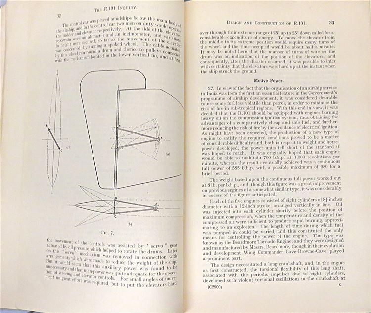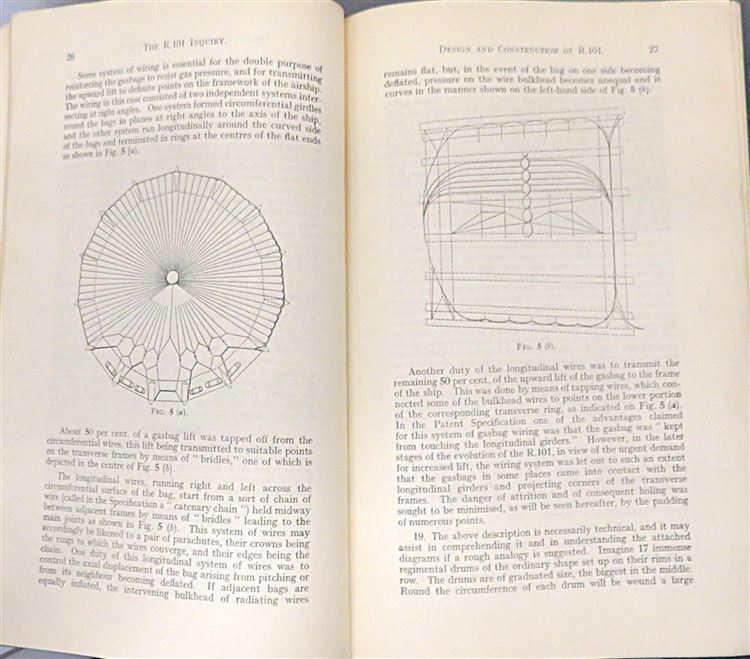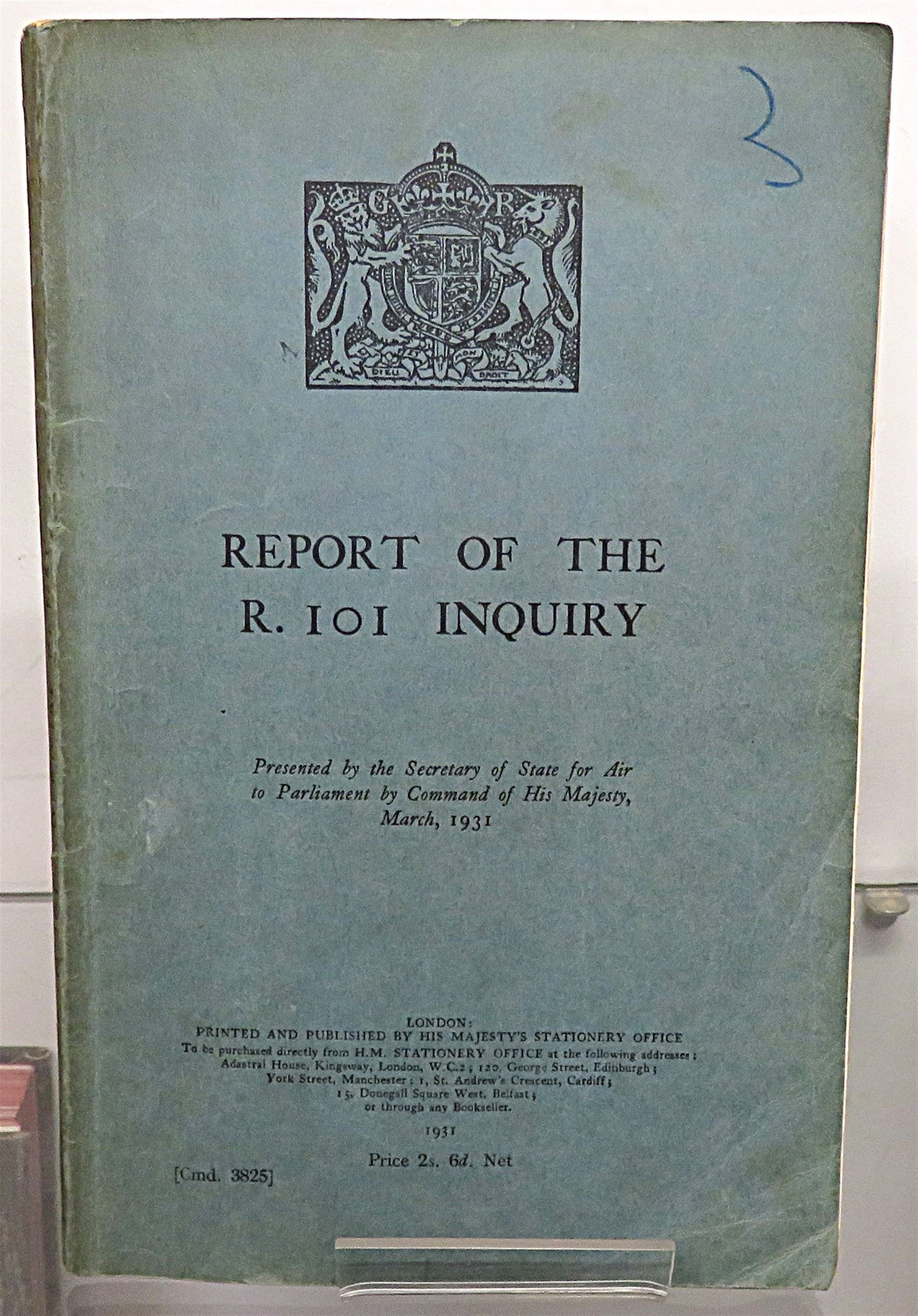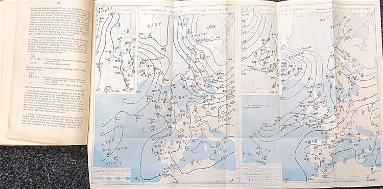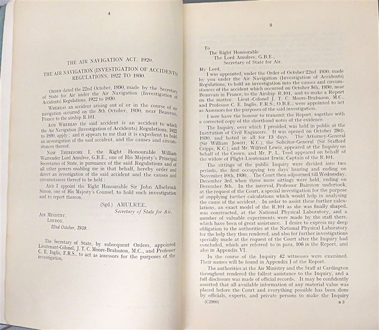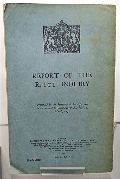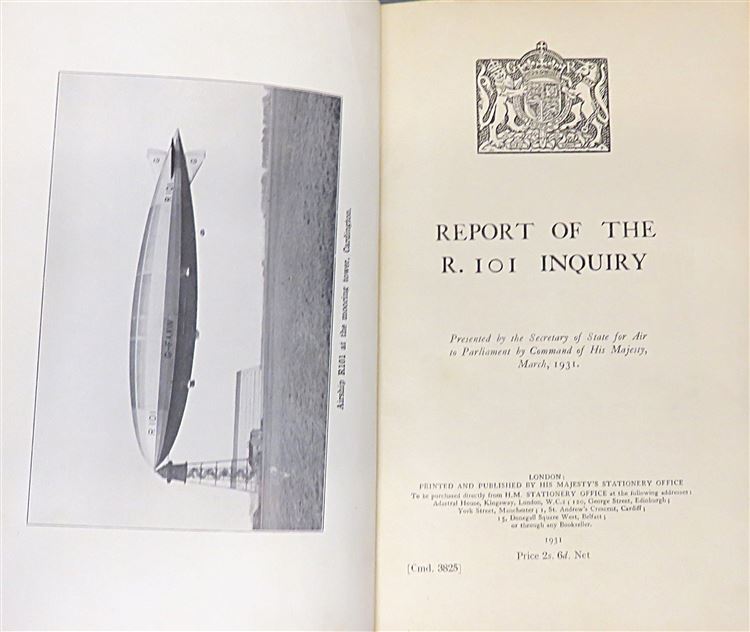 St Mary's Books is proud to present this 1931 first edition of the "Report of the R.101 Inquiry" written by John Simon, as commanded by His Majesty and later presented to Parliament by Lord Amulree, Secretary of State for Air. This teal paperback book is complete with the royal crest on the front cover in black ink, and contains 129 pages of text, supplemented by diagrams, fold out weather maps and tables of information. Within the pages of this book, one finds the official government inquiry into R.101, a British rigid airship that crashed on its maiden voyage to India in 1930, killing 48 of the 54 people on board. The catastrophic failure of the airship, and the impact of this subsequent report, effectively ended the airship programme. This report is in very good condition - though the cover is slightly stained, there is a small inscription on the cover and front free endpaper, and the corners are slightly bumped or folded - this little slice of history remains miraculously well preserved. "Report of the R.101 Inquiry" is looking for a new home and would make for the perfect gift for anyone with an interest in the history of British dirigeables.