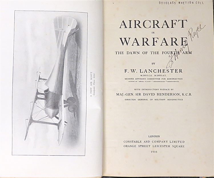 St Mary's Books is proud to present this 1916 early edition of "Aircraft in Warfare: The Dawn of the Fourth Arm" by F. W. Lanchester, signed twice by Henry Royce of Rolls-Royce. This copy is incredibly rare, as not only did Royce seldom sign books and other documents, but this particular copy he signed twice - once on the free endpaper and once on the title page. Complete with it's partial original dark green dustjacket, this hardback book is bound in red cloth with gold gilt lettering to the spine. Inside, one finds i-xviii and 222 pages of text supplemented by diagrams and black and white photographs, detailing the contemporary state of scientific, military, and manufacturing progress in aviation. This rare book is in good condition - there is some slight staining on the cover, some fading to the spine and two Douglass Whetton College stamps on the free endpaper and title page of the book. However, the interior remains impeccably clean and readable. "Aircraft in Warfare" is looking for a new home and would make for a perfect gift for any aviation enthusiast or collector of Rolls-Royce memorabilia.