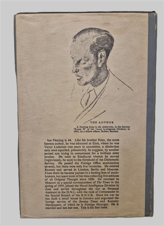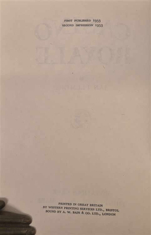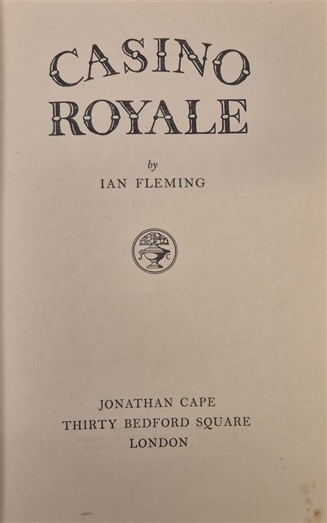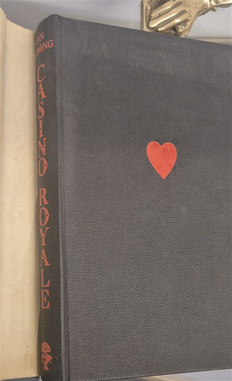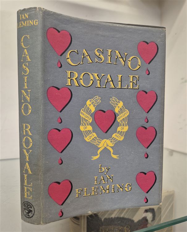 St Mary's books are pleased to offer 1st James Bond Novel. A very attractive second impression of Ian Fleming’s first James Bond novel, published only weeks after the legendary April 1953 first edition. Bound in the publisher’s original black cloth, spine lettered in red, with the heart-device motif in red to the front board — the same striking design as the first printing.The original dust jacket is present, unclipped and showing the printed price. Designed by the artist Ian Fleming himself, the jacket retains its strong red and black elements with the playing-card heart motif across the front panel. Second-impression jackets are notably scarce, as most were discarded when copies were read; surviving examples in collectible condition seldom appear on the market. Gilbert (2.2) Second Impression, Jacket B, 1953 , The collation, pagination and binding are all as described under (2.1).Dust-wrapper: Reset. The front flap reprints quotes from ten newspaper reviews. The remaining panels are the same as lined under (12)Printing Errors/Textual Variations:Page 14. lines 10-1 Combined Intelligence Agency' for "Central Intelligence Agency.Page 96. line st: 'ace of spaces' should read 'ace of spades. Previous owners name to the front free endpaper. 218 pp.