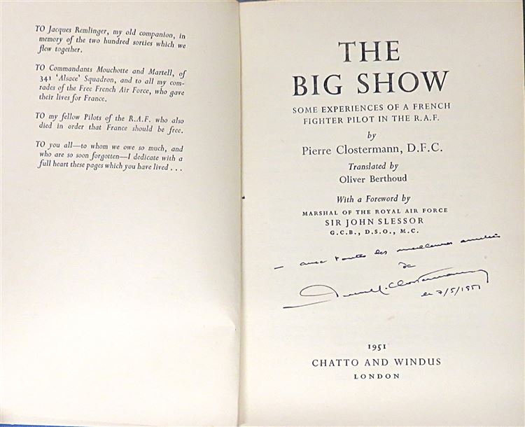 St Mary's Books is proud to present this 1951 second impression of "The Big Show: Some Experiences of a French Fighter Pilot in the R.A.F." signed by the author, Pierre Clostermann. Housed in its original pictorial dustjacket featuring a dramatic full colour illustration of an aerial battle, this hardback book is bound in blue cloth with gold gilt lettering to its spine. Inside, one finds 256 pages of text, supplemented by contemporary black and white photographs, providing the authors authentic inside story of the war in the air over Europe, from 1942 to the Armistice. Within the pages of this book, the reader is treated to the authors' impressions of action, jotted down moments after each operation ended, and carrying with them the very feeling of the man in the cockpit. This copy, and its original dustjacket, are in very good condition. With no notable blemishes or imperfections to the dustjacket, and only some very minor foxing to report on the prelims, this book remains impeccably well preserved. "The Big Show" is looking for a new home and would make for the perfect gift for any aviation enthusiast hoping to read a thrilling true story.