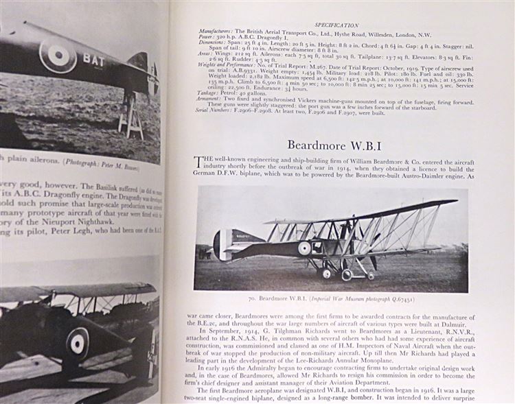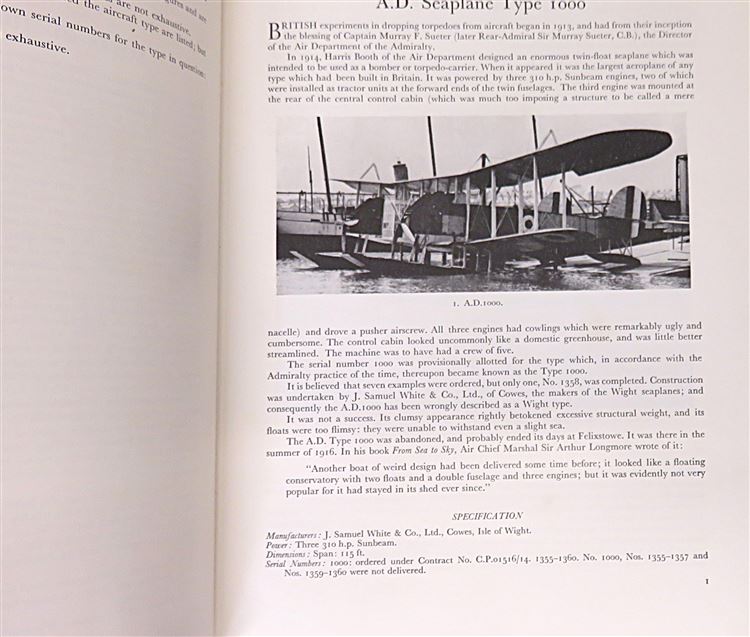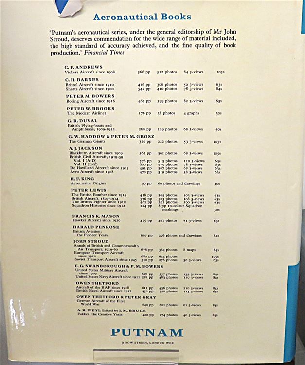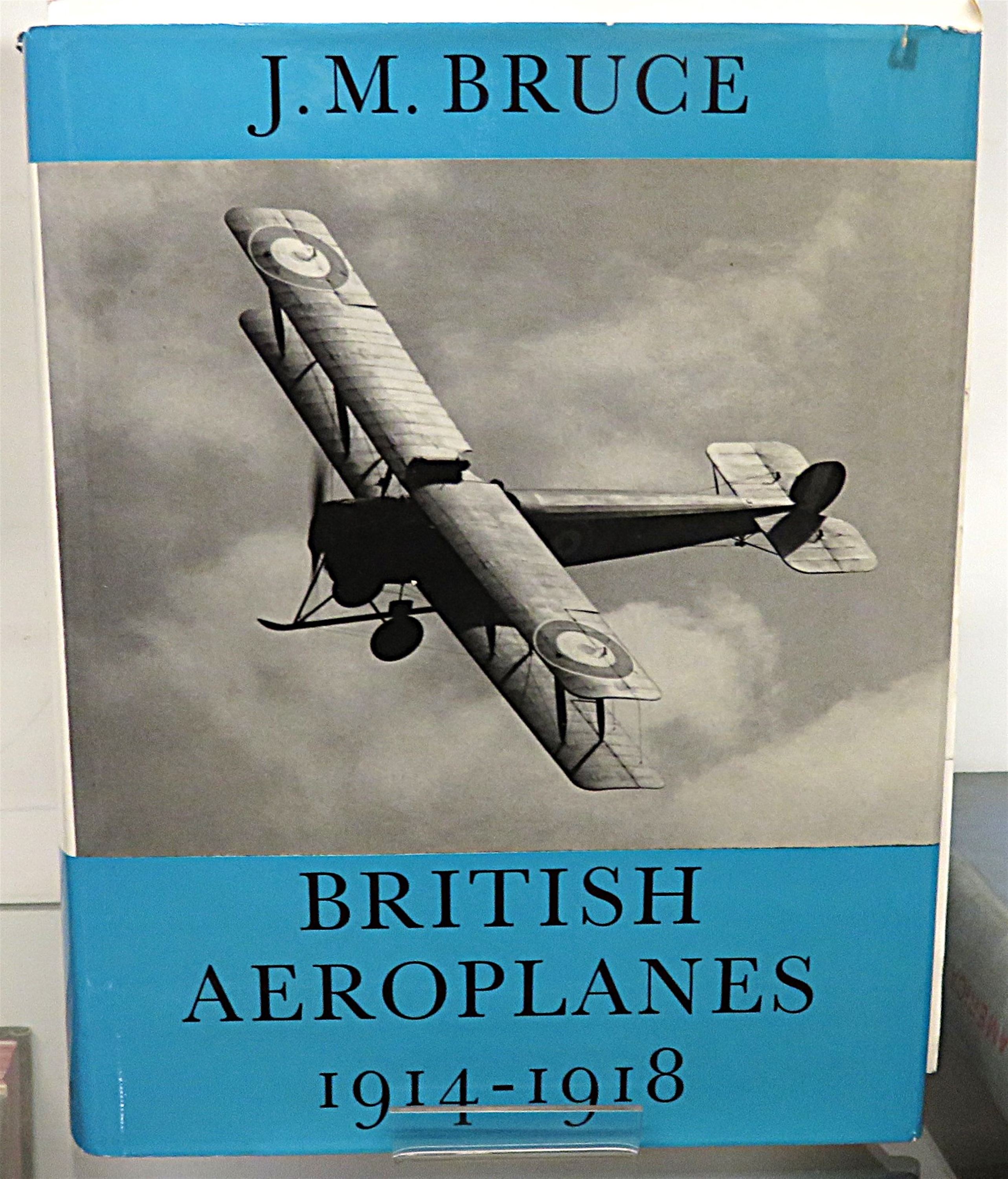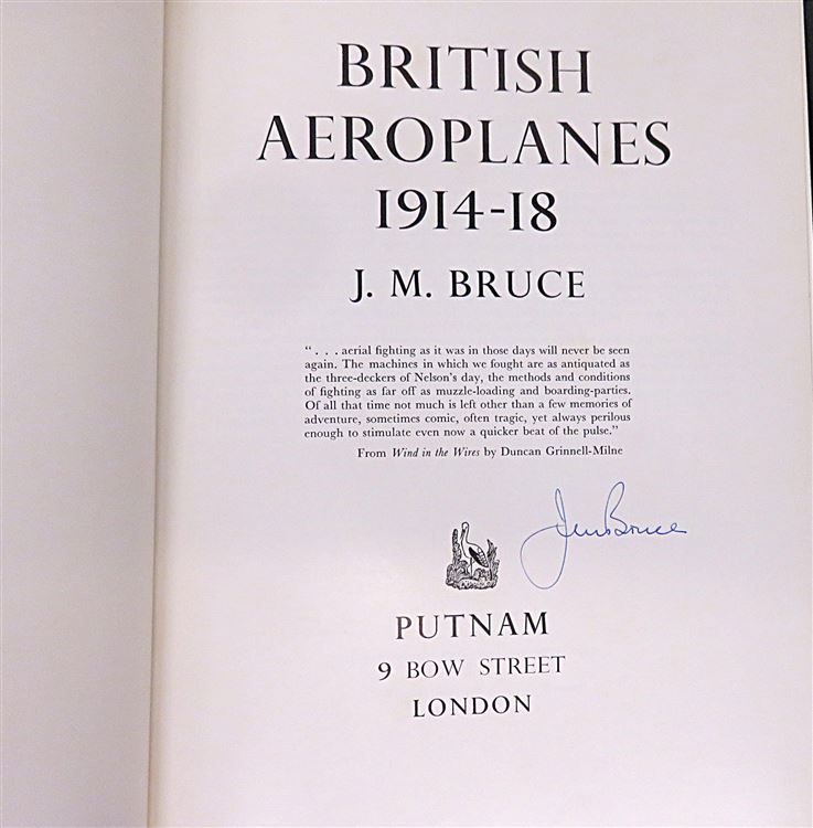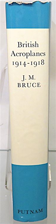 St Mary's Books is proud to present this 1969 second impression of "British Aeroplanes 1914-1918" signed by the author, J. M. Bruce. Housed in its original blue paper dustjacket, as well as its later blue dustjacket featuring a black and white photograph of an early aeroplane, this hardback book is bound in green cloth with gold gilt lettering and decorations on the spine. Inside, one finds assorted ephemera associated with the publication of the book, and some clippings of some further writings by the author. Inside, one finds i-viii and 742 pages of text, peppered with black and white photographs, tables of data, and intricate details about British Aeroplanes in this exciting and innovative wartime period. This book, and its two original dustjackets, are in very good condition. The earlier paper dustjacket has some minor bumps on the edges, but the later dustjacket appears largely unscathed. In addition, the cloth boards and the interior of the book are clean and bright. "British Aeroplanes 1914-1918" is looking for a new home and would make for the perfect gift for any aviation enthusiast.