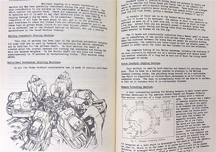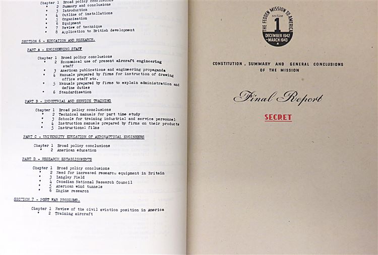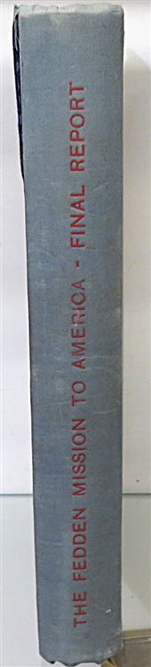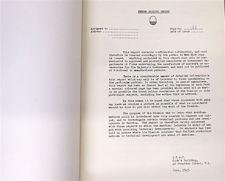 St Mary's Books is proud to present this 1943 limited edition (Copy No. 46) of "The Fedden Mission to America - Final Report". Bound in light blue cloth with red ink lettering to the spine, this hardback book contains a detailed account of contemporary American methods for resolving technical problems and for exploring new developments in aviation, primarily concerned with the areas where the American industry was ahead of the British, all dedicated towards improving the British war effort. Inside, one finds photographs, diagrams, tables of data, corporate hierarchy flowcharts, and detailed writings concerning the comparative state of British and American aviation in specific areas. This copy is in good to very good condition - with some minor foxing on the boards and the edges of the book, as well as some slight bumping of the boards at the corners and edges. However, the interior remains clean, bright, and readable - remarkably so given the age and rarity of this copy. "The Fedden Mission to America - Final Report" is looking for a new home and would make for the perfect gift for any aviation enthusiast.