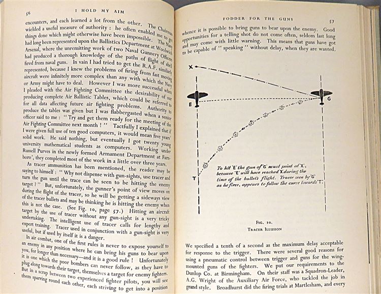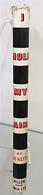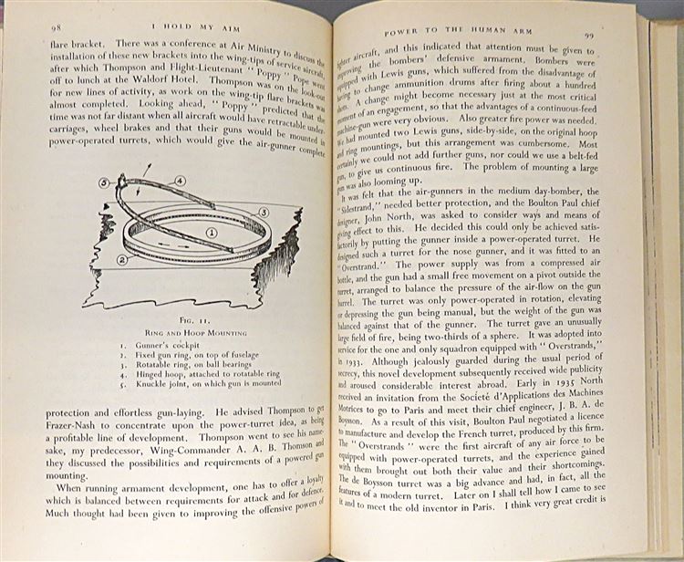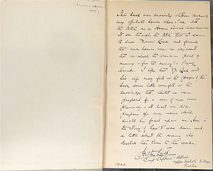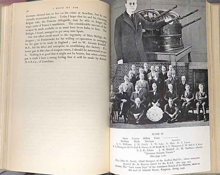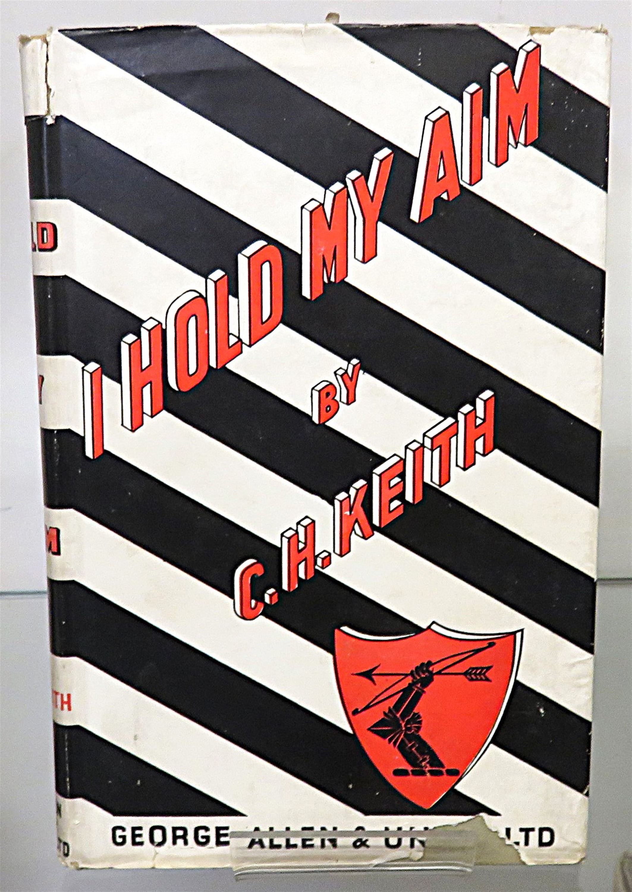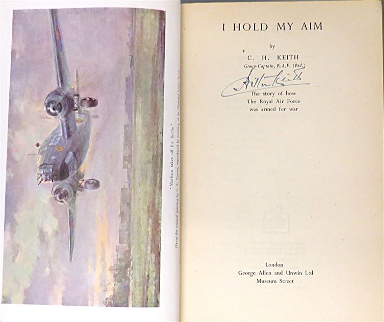 St Mary's Books are proud to present this 1946 first edition of "I Hold My Aim" signed twice by the author C. H. Keith alongside a detailed inscription describing his experiences writing the book during his time at the BBC as a Home Service Announcer. Housed in its striking original black and white dustjacket with bright red lettering, this hardback book is bound in beige cloth with black ink lettering on the spine. Inside, one finds 174 pages of text, supplemented by black and white photographs and black ink diagrams, where the reader is treated to a thrilling account of the adventures and trials of those who selected and developed the weapons used by aircrews in the Second World War, in which the author traces the development of air armament and invites a look into the future. This copy is complete with a remarkable inscription, providing even more of the authors insight on the matter at hand, and highlighting his experiences writing this book. This copy, and it's original dustjacket, are in good condition - the dustjacket is bumped and torn with a piece missing from the front section, in addition, the boards of the book are foxed and the cloth is faded. However, the interior pages of the book appear remarkably clean, bright, and readable. "I Hold My Aim" is looking for a new home and would make for a perfect gift for any aviation enthusiast.